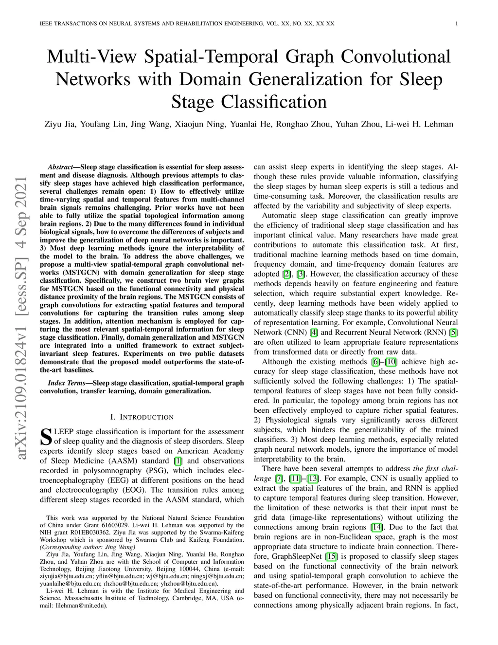 Sleep stage classification is essential for sleep assessment and disease diagnosis. Although previous attempts to classify sleep stages have achieved high classification performance, several challenges remain open: 1) How to effectively utilize time-varying spatial and temporal features from multi-channel brain signals remains challenging. Prior works have not been able to fully utilize the spatial topological information among brain regions. 2) Due to the many differences found in individual biological signals, how to overcome the differences of subjects and improve the generalization of deep neural networks is important. 3) Most deep learning methods ignore the interpretability of the model to the brain. To address the above challenges, we propose a multi-view spatial-temporal graph convolutional networks (MSTGCN) with domain generalization for sleep stage classification. Specifically, we construct two brain view graphs for MSTGCN based on the functional connectivity and physical distance proximity of the brain regions. The MSTGCN consists of graph convolutions for extracting spatial features and temporal convolutions for capturing the transition rules among sleep stages. In addition, attention mechanism is employed for capturing the most relevant spatial-temporal information for sleep stage classification. Finally, domain generalization and MSTGCN are integrated into a unified framework to extract subject-invariant sleep features. Experiments on two public datasets demonstrate that the proposed model outperforms the state-of-the-art baselines.