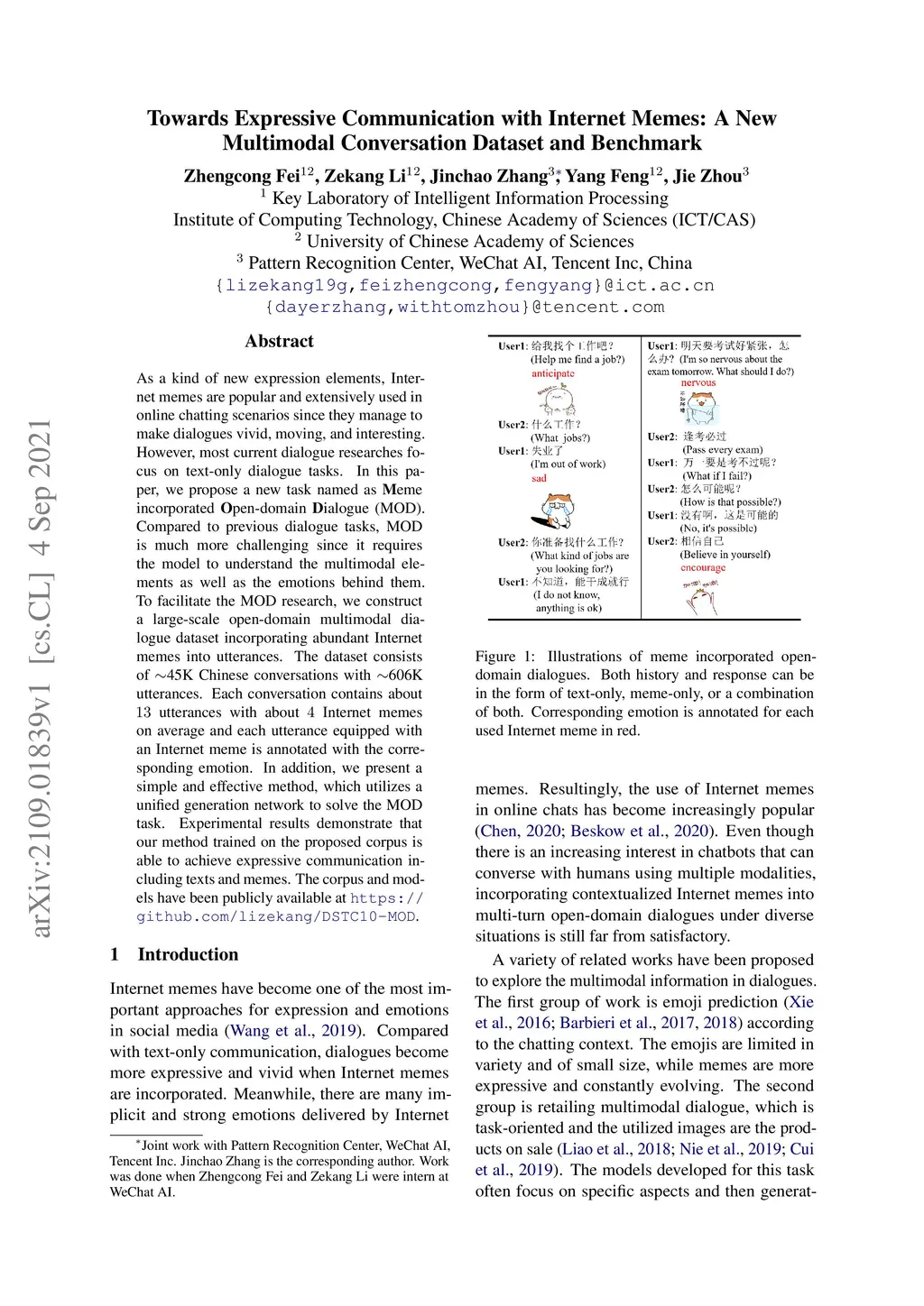 As a kind of new expression elements, Internet memes are popular and extensively used in online chatting scenarios since they manage to make dialogues vivid, moving, and interesting. However, most current dialogue researches focus on text-only dialogue tasks. In this paper, we propose a new task named as \textbf{M}eme incorporated \textbf{O}pen-domain \textbf{D}ialogue (MOD). Compared to previous dialogue tasks, MOD is much more challenging since it requires the model to understand the multimodal elements as well as the emotions behind them. To facilitate the MOD research, we construct a large-scale open-domain multimodal dialogue dataset incorporating abundant Internet memes into utterances. The dataset consists of 45K Chinese conversations with 606K utterances. Each conversation contains about utterances with about Internet memes on average and each utterance equipped with an Internet meme is annotated with the corresponding emotion. In addition, we present a simple and effective method, which utilizes a unified generation network to solve the MOD task. Experimental results demonstrate that our method trained on the proposed corpus is able to achieve expressive communication including texts and memes. The corpus and models have been publicly available at https://github.com/lizekang/DSTC10-MOD.