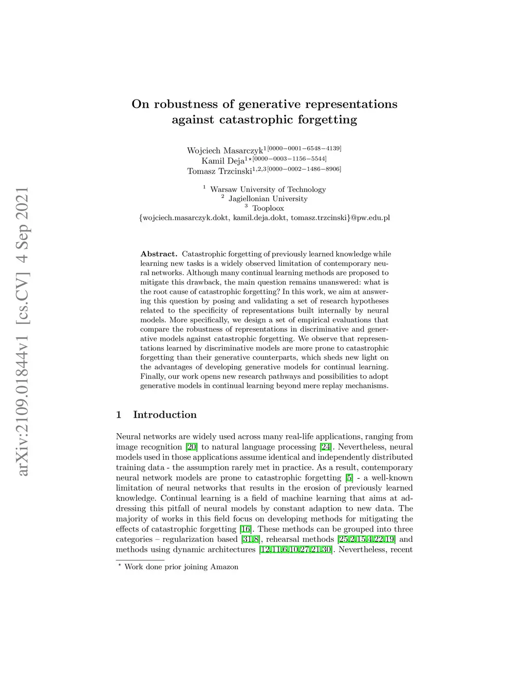 Catastrophic forgetting of previously learned knowledge while learning new tasks is a widely observed limitation of contemporary neural networks. Although many continual learning methods are proposed to mitigate this drawback, the main question remains unanswered: what is the root cause of catastrophic forgetting? In this work, we aim at answering this question by posing and validating a set of research hypotheses related to the specificity of representations built internally by neural models. More specifically, we design a set of empirical evaluations that compare the robustness of representations in discriminative and generative models against catastrophic forgetting. We observe that representations learned by discriminative models are more prone to catastrophic forgetting than their generative counterparts, which sheds new light on the advantages of developing generative models for continual learning. Finally, our work opens new research pathways and possibilities to adopt generative models in continual learning beyond mere replay mechanisms.