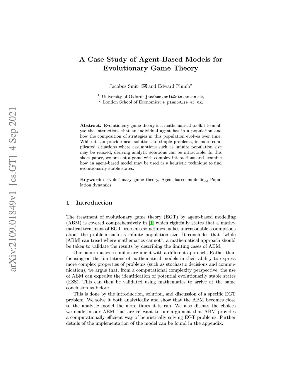 Evolutionary game theory is a mathematical toolkit to analyse the interactions that an individual agent has in a population and how the composition of strategies in this population evolves over time. While it can provide neat solutions to simple problems, in more complicated situations where assumptions such as infinite population size may be relaxed, deriving analytic solutions can be intractable. In this short paper, we present a game with complex interactions and examine how an agent-based model may be used as a heuristic technique to find evolutionarily stable states.