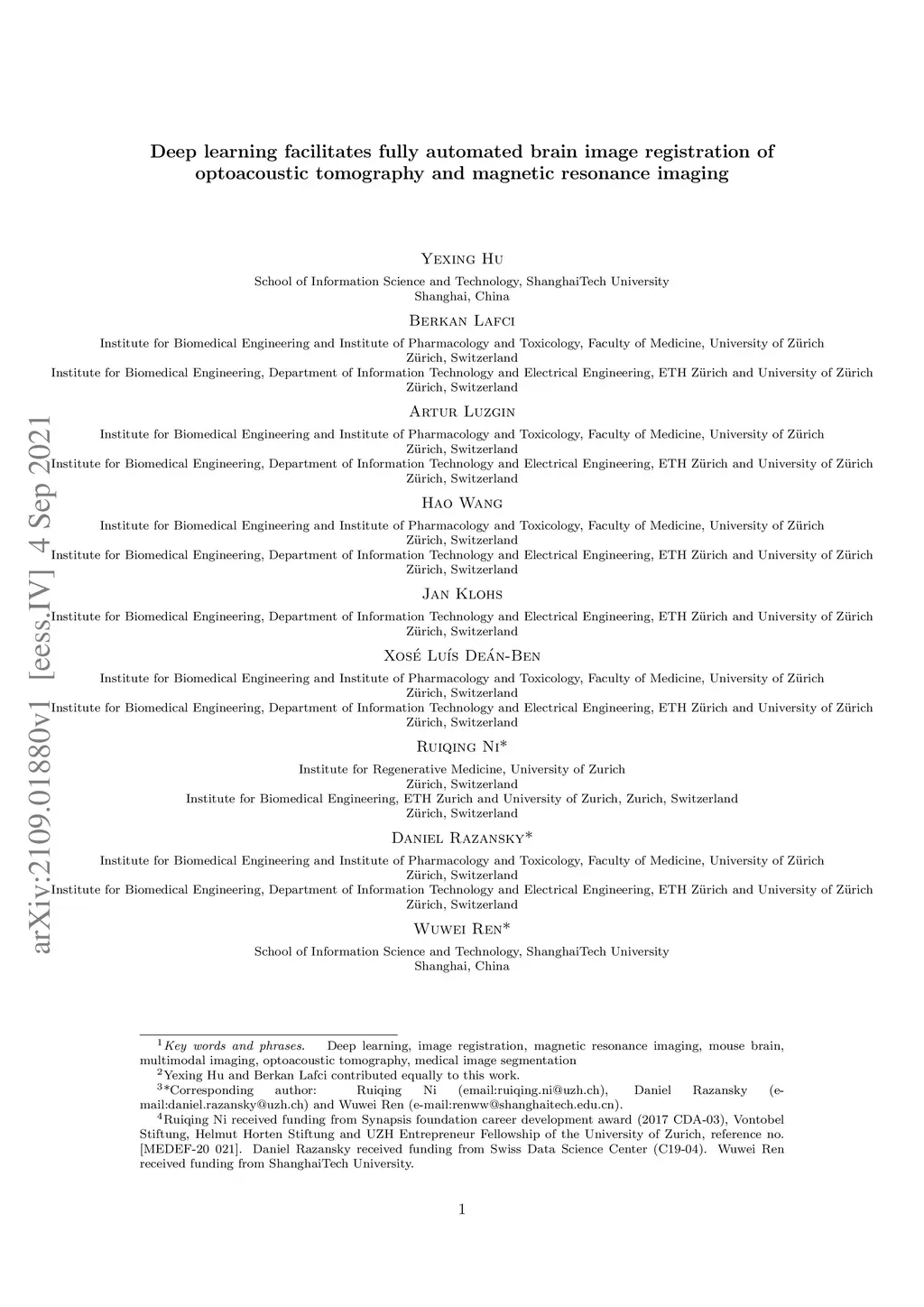 Multi-spectral optoacoustic tomography (MSOT) is an emerging optical imaging method providing multiplex molecular and functional information from the rodent brain. It can be greatly augmented by magnetic resonance imaging (MRI) that offers excellent soft-tissue contrast and high-resolution brain anatomy. Nevertheless, registration of multi-modal images remains challenging, chiefly due to the entirely different image contrast rendered by these modalities. Previously reported registration algorithms mostly relied on manual user-dependent brain segmentation, which compromised data interpretation and accurate quantification. Here we propose a fully automated registration method for MSOT-MRI multimodal imaging empowered by deep learning. The automated workflow includes neural network-based image segmentation to generate suitable masks, which are subsequently registered using an additional neural network. Performance of the algorithm is showcased with datasets acquired by cross-sectional MSOT and high-field MRI preclinical scanners. The automated registration method is further validated with manual and half-automated registration, demonstrating its robustness and accuracy.