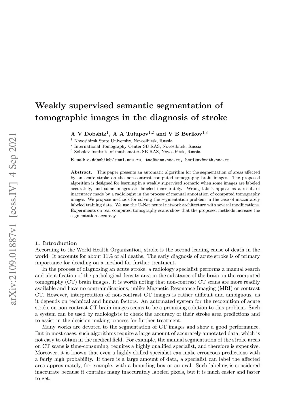 This paper presents an automatic algorithm for the segmentation of areas affected by an acute stroke on the non-contrast computed tomography brain images. The proposed algorithm is designed for learning in a weakly supervised scenario when some images are labeled accurately, and some images are labeled inaccurately. Wrong labels appear as a result of inaccuracy made by a radiologist in the process of manual annotation of computed tomography images. We propose methods for solving the segmentation problem in the case of inaccurately labeled training data. We use the U-Net neural network architecture with several modifications. Experiments on real computed tomography scans show that the proposed methods increase the segmentation accuracy.