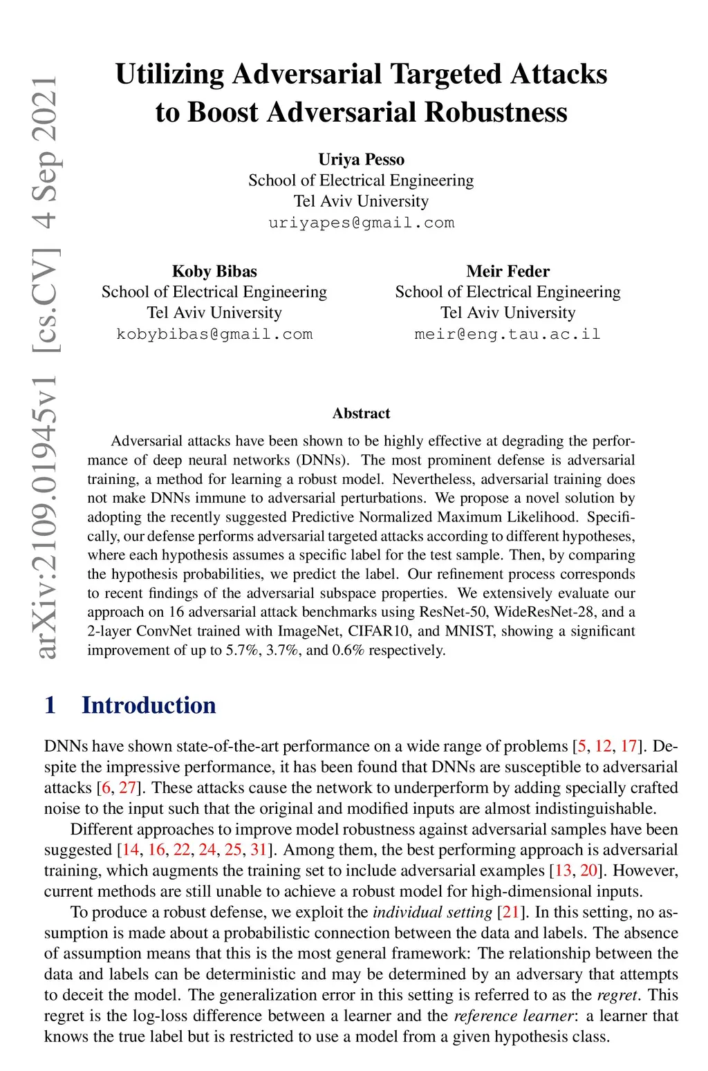 Adversarial attacks have been shown to be highly effective at degrading the performance of deep neural networks (DNNs). The most prominent defense is adversarial training, a method for learning a robust model. Nevertheless, adversarial training does not make DNNs immune to adversarial perturbations. We propose a novel solution by adopting the recently suggested Predictive Normalized Maximum Likelihood. Specifically, our defense performs adversarial targeted attacks according to different hypotheses, where each hypothesis assumes a specific label for the test sample. Then, by comparing the hypothesis probabilities, we predict the label. Our refinement process corresponds to recent findings of the adversarial subspace properties. We extensively evaluate our approach on 16 adversarial attack benchmarks using ResNet-50, WideResNet-28, and a2-layer ConvNet trained with ImageNet, CIFAR10, and MNIST, showing a significant improvement of up to 5.7%, 3.7%, and 0.6% respectively.