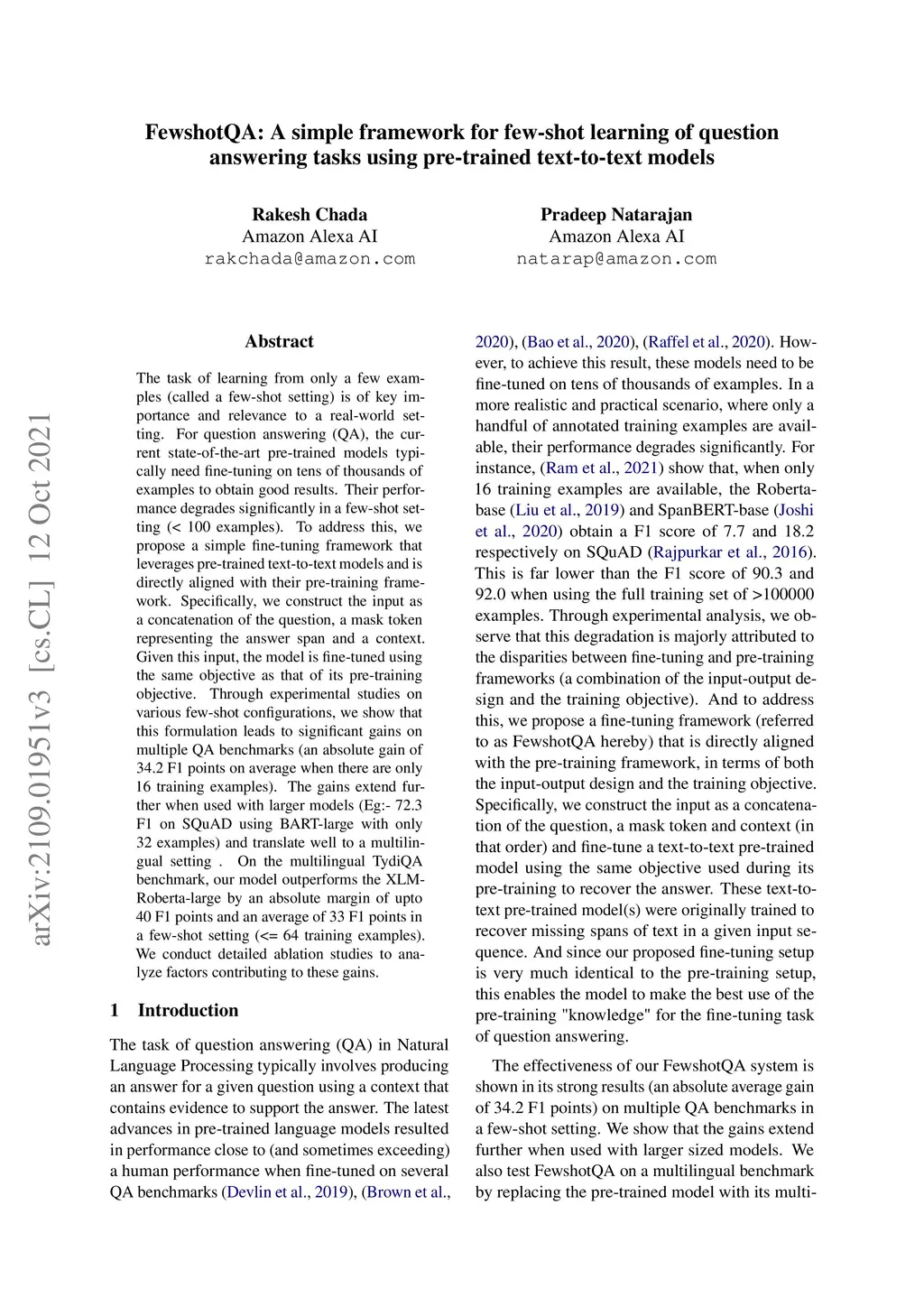 The task of learning from only a few examples (called a few-shot setting) is of key importance and relevance to a real-world setting. For question answering (QA), the current state-of-the-art pre-trained models typically need fine-tuning on tens of thousands of examples to obtain good results. Their performance degrades significantly in a few-shot setting (< 100 examples). To address this, we propose a simple fine-tuning framework that leverages pre-trained text-to-text models and is directly aligned with their pre-training framework. Specifically, we construct the input as a concatenation of the question, a mask token representing the answer span and a context. Given this input, the model is fine-tuned using the same objective as that of its pre-training objective. Through experimental studies on various few-shot configurations, we show that this formulation leads to significant gains on multiple QA benchmarks (an absolute gain of 34.2 F1 points on average when there are only 16 training examples). The gains extend further when used with larger models (Eg:- 72.3 F1 on SQuAD using BART-large with only 32 examples) and translate well to a multilingual setting . On the multilingual TydiQA benchmark, our model outperforms the XLM-Roberta-large by an absolute margin of upto 40 F1 points and an average of 33 F1 points in a few-shot setting (<= 64 training examples). We conduct detailed ablation studies to analyze factors contributing to these gains.