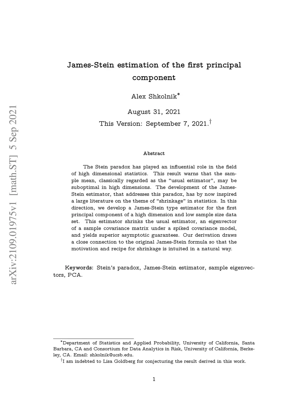 The Stein paradox has played an influential role in the field of high dimensional statistics. This result warns that the sample mean, classically regarded as the "usual estimator", may be suboptimal in high dimensions. The development of the James-Stein estimator, that addresses this paradox, has by now inspired a large literature on the theme of "shrinkage" in statistics. In this direction, we develop a James-Stein type estimator for the first principal component of a high dimension and low sample size data set. This estimator shrinks the usual estimator, an eigenvector of a sample covariance matrix under a spiked covariance model, and yields superior asymptotic guarantees. Our derivation draws a close connection to the original James-Stein formula so that the motivation and recipe for shrinkage is intuited in a natural way.