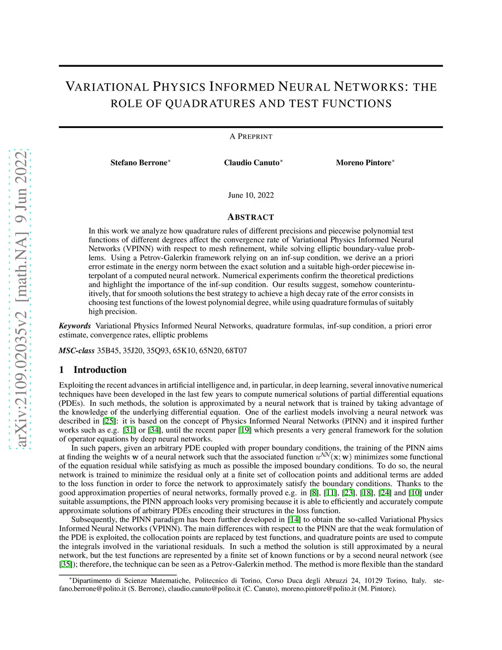 In this work we analyze how Gaussian or Newton-Cotes quadrature rules of different precisions and piecewise polynomial test functions of different degrees affect the convergence rate of Variational Physics Informed Neural Networks (VPINN) with respect to mesh refinement, while solving elliptic boundary-value problems. Using a Petrov-Galerkin framework relying on an inf-sup condition, we derive an a priori error estimate in the energy norm between the exact solution and a suitable high-order piecewise interpolant of a computed neural network. Numerical experiments confirm the theoretical predictions, and also indicate that the error decay follows the same behavior when the neural network is not interpolated. Our results suggest, somehow counterintuitively, that for smooth solutions the best strategy to achieve a high decay rate of the error consists in choosing test functions of the lowest polynomial degree, while using quadrature formulas of suitably high precision.