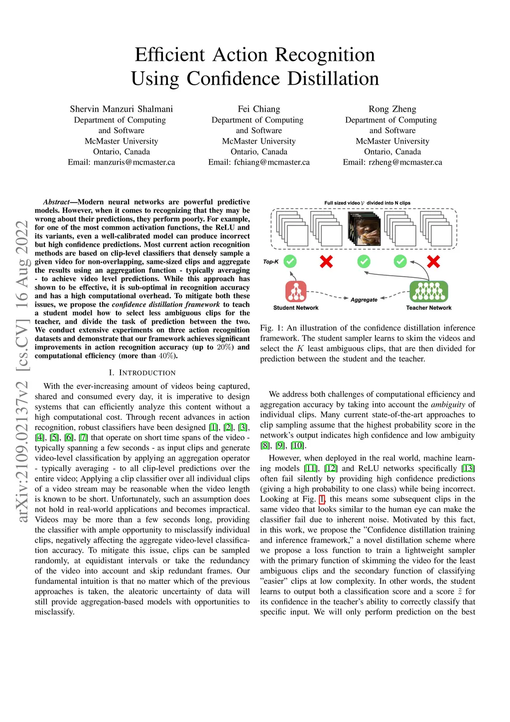 Modern neural networks are powerful predictive models. However, when it comes to recognizing that they may be wrong about their predictions, they perform poorly. For example, for one of the most common activation functions, the ReLU and its variants, even a well-calibrated model can produce incorrect but high confidence predictions. In the related task of action recognition, most current classification methods are based on clip-level classifiers that densely sample a given video for non-overlapping, same-sized clips and aggregate the results using an aggregation function - typically averaging - to achieve video level predictions. While this approach has shown to be effective, it is sub-optimal in recognition accuracy and has a high computational overhead. To mitigate both these issues, we propose the confidence distillation framework to teach a representation of uncertainty of the teacher to the student sampler and divide the task of full video prediction between the student and the teacher models. We conduct extensive experiments on three action recognition datasets and demonstrate that our framework achieves significant improvements in action recognition accuracy (up to 20%) and computational efficiency (more than 40%).