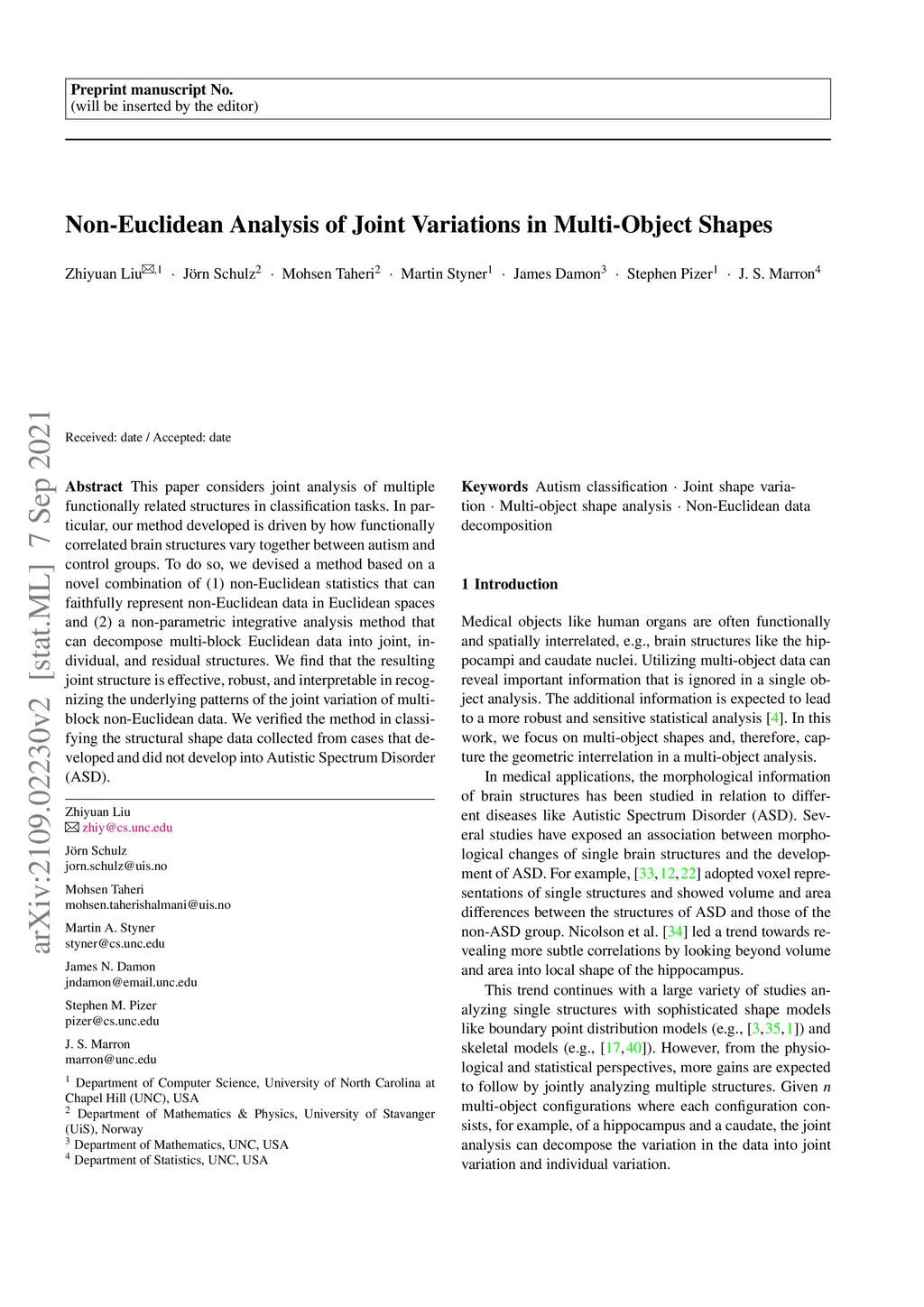 This paper considers joint analysis of multiple functionally related structures in classification tasks. In particular, our method developed is driven by how functionally correlated brain structures vary together between autism and control groups. To do so, we devised a method based on a novel combination of (1) non-Euclidean statistics that can faithfully represent non-Euclidean data in Euclidean spaces and (2) a non-parametric integrative analysis method that can decompose multi-block Euclidean data into joint, individual, and residual structures. We find that the resulting joint structure is effective, robust, and interpretable in recognizing the underlying patterns of the joint variation of multi-block non-Euclidean data. We verified the method in classifying the structural shape data collected from cases that developed and did not develop into Autistic Spectrum Disorder (ASD).