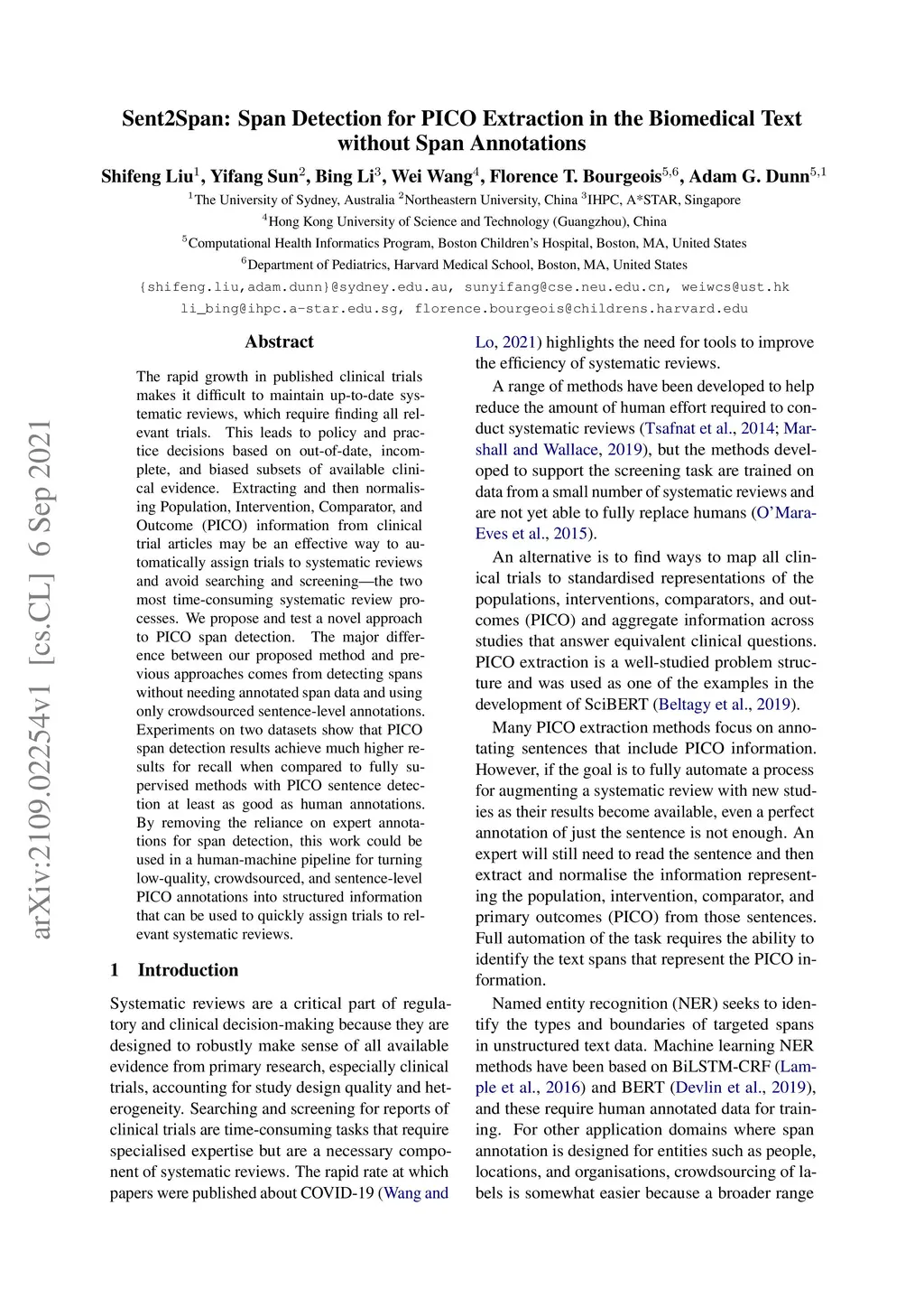 The rapid growth in published clinical trials makes it difficult to maintain up-to-date systematic reviews, which requires finding all relevant trials. This leads to policy and practice decisions based on out-of-date, incomplete, and biased subsets of available clinical evidence. Extracting and then normalising Population, Intervention, Comparator, and Outcome (PICO) information from clinical trial articles may be an effective way to automatically assign trials to systematic reviews and avoid searching and screening - the two most time-consuming systematic review processes. We propose and test a novel approach to PICO span detection. The major difference between our proposed method and previous approaches comes from detecting spans without needing annotated span data and using only crowdsourced sentence-level annotations. Experiments on two datasets show that PICO span detection results achieve much higher results for recall when compared to fully supervised methods with PICO sentence detection at least as good as human annotations. By removing the reliance on expert annotations for span detection, this work could be used in human-machine pipeline for turning low-quality crowdsourced, and sentence-level PICO annotations into structured information that can be used to quickly assign trials to relevant systematic reviews.