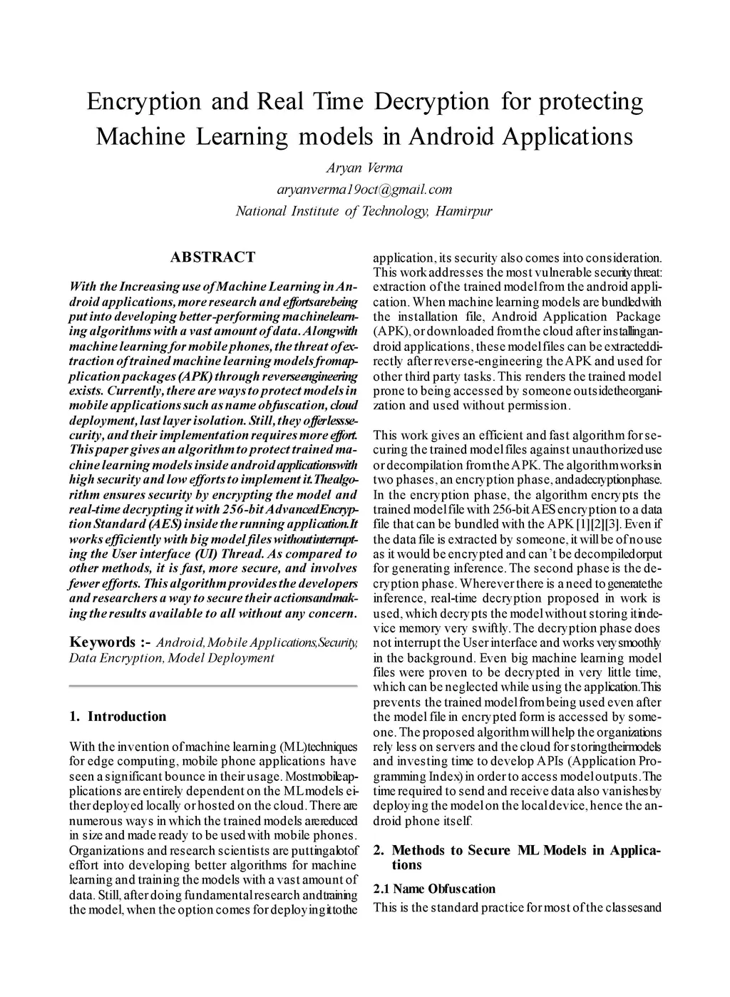 With the Increasing use of Machine Learning in Android applications, more research and efforts are being put into developing better-performing machine learning algorithms with a vast amount of data. Along with machine learning for mobile phones, the threat of extraction of trained machine learning models from application packages (APK) through reverse engineering exists. Currently, there are ways to protect models in mobile applications such as name obfuscation, cloud deployment, last layer isolation. Still, they offer less security, and their implementation requires more effort. This paper gives an algorithm to protect trained machine learning models inside android applications with high security and low efforts to implement it. The algorithm ensures security by encrypting the model and real-time decrypting it with 256-bit Advanced Encryption Standard (AES) inside the running application. It works efficiently with big model files without interrupting the User interface (UI) Thread. As compared to other methods, it is fast, more secure, and involves fewer efforts. This algorithm provides the developers and researchers a way to secure their actions and making the results available to all without any concern.