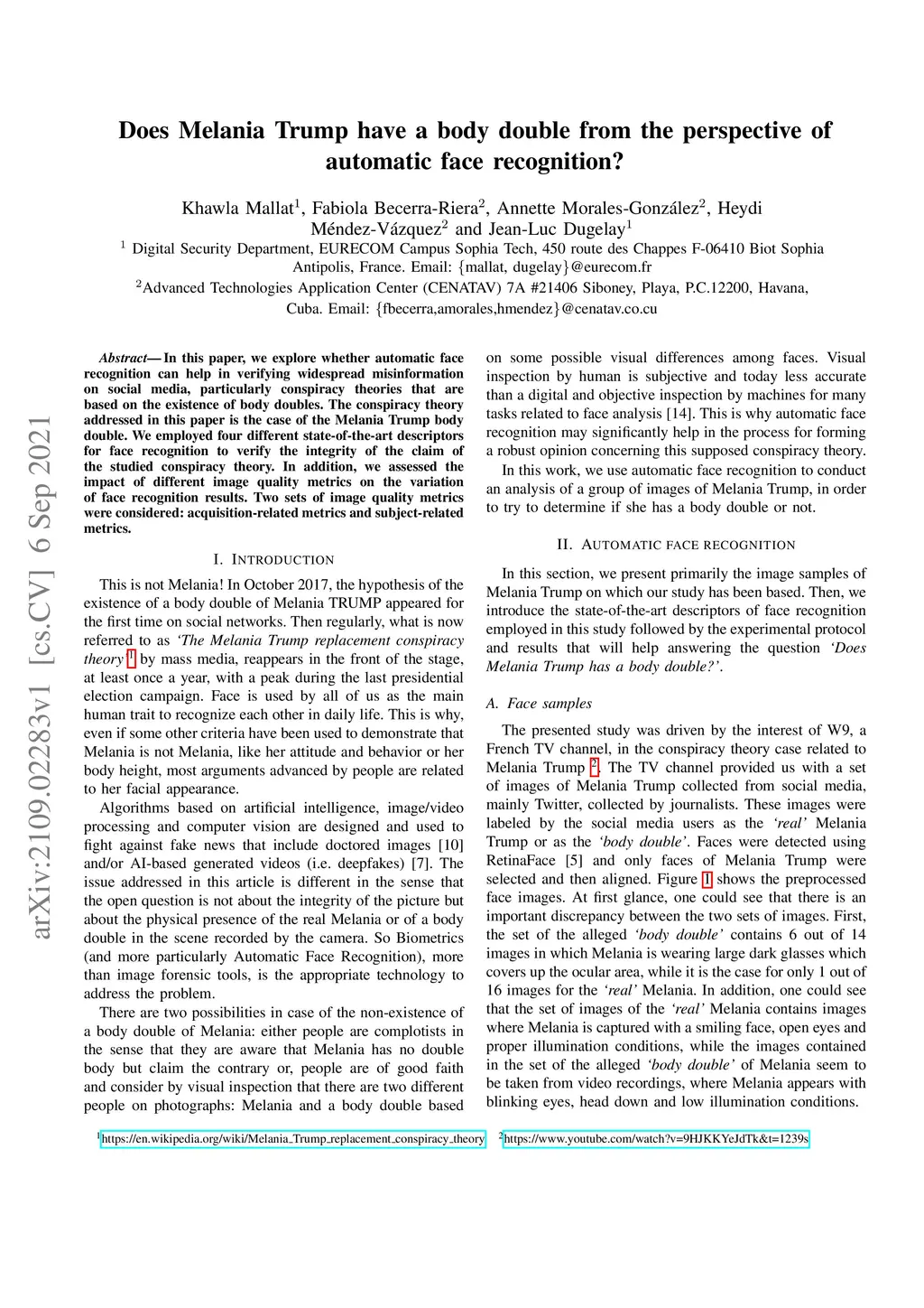 In this paper, we explore whether automatic face recognition can help in verifying widespread misinformation on social media, particularly conspiracy theories that are based on the existence of body doubles. The conspiracy theory addressed in this paper is the case of the Melania Trump body double. We employed four different state-of-the-art descriptors for face recognition to verify the integrity of the claim of the studied conspiracy theory. In addition, we assessed the impact of different image quality metrics on the variation of face recognition results. Two sets of image quality metrics were considered: acquisition-related metrics and subject-related metrics.