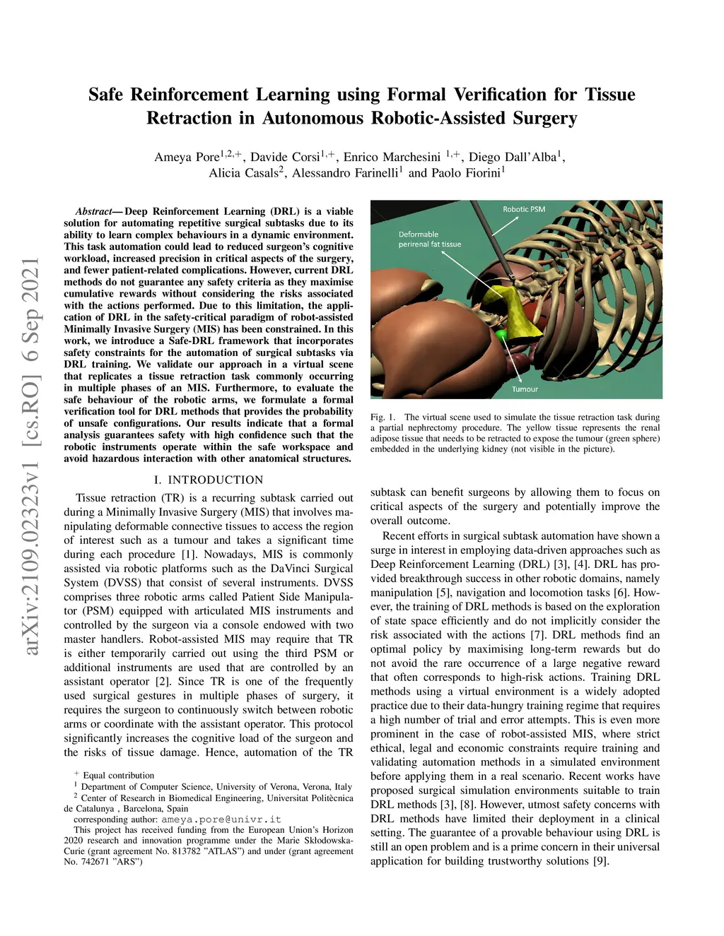 Deep Reinforcement Learning (DRL) is a viable solution for automating repetitive surgical subtasks due to its ability to learn complex behaviours in a dynamic environment. This task automation could lead to reduced surgeon's cognitive workload, increased precision in critical aspects of the surgery, and fewer patient-related complications. However, current DRL methods do not guarantee any safety criteria as they maximise cumulative rewards without considering the risks associated with the actions performed. Due to this limitation, the application of DRL in the safety-critical paradigm of robot-assisted Minimally Invasive Surgery (MIS) has been constrained. In this work, we introduce a Safe-DRL framework that incorporates safety constraints for the automation of surgical subtasks via DRL training. We validate our approach in a virtual scene that replicates a tissue retraction task commonly occurring in multiple phases of an MIS. Furthermore, to evaluate the safe behaviour of the robotic arms, we formulate a formal verification tool for DRL methods that provides the probability of unsafe configurations. Our results indicate that a formal analysis guarantees safety with high confidence such that the robotic instruments operate within the safe workspace and avoid hazardous interaction with other anatomical structures.