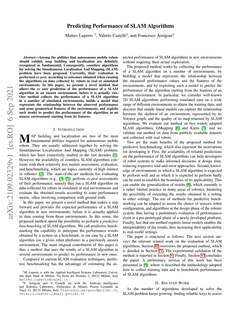Among the abilities that autonomous mobile robots should exhibit, map building and localization are definitely recognized as fundamental. Consequently, countless algorithms for solving the Simultaneous Localization And Mapping (SLAM) problem have been proposed. Currently, their evaluation is performed ex-post, according to outcomes obtained when running the algorithms on data collected by robots in real or simulated environments. In this paper, we present a novel method that allows the ex-ante prediction of the performance of a SLAM algorithm in an unseen environment, before it is actually run. Our method collects the performance of a SLAM algorithm in a number of simulated environments, builds a model that represents the relationship between the observed performance and some geometrical features of the environments, and exploits such model to predict the performance of the algorithm in an unseen environment starting from its features.