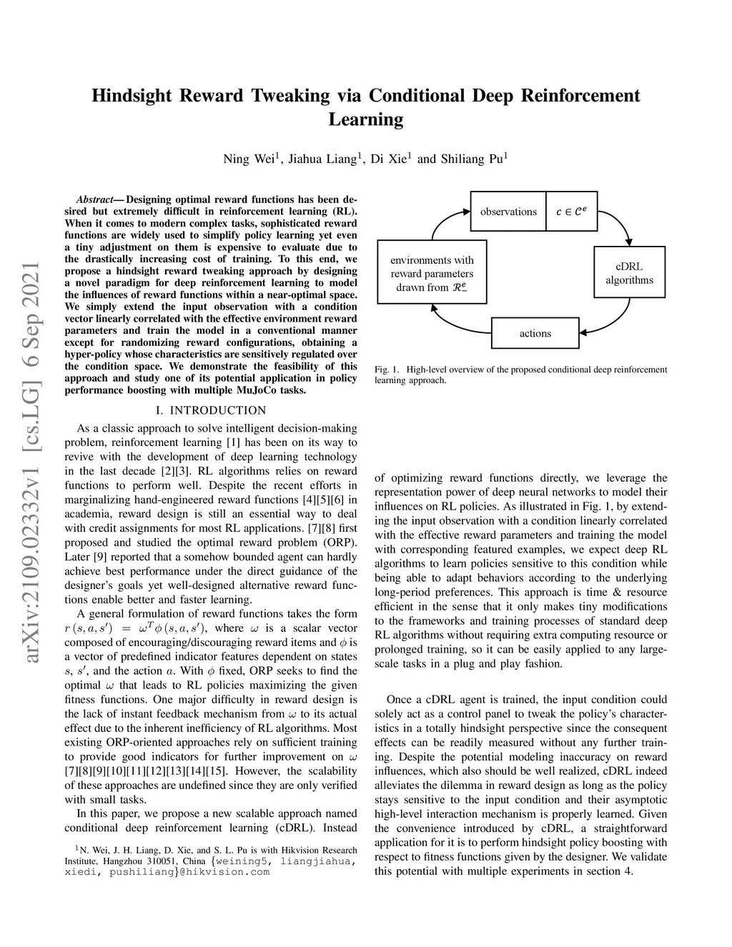 Hindsight Reward Tweaking via Conditional Deep Reinforcement Learning