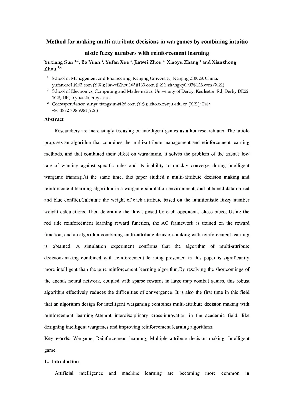 Researchers are increasingly focusing on intelligent games as a hot research area.The article proposes an algorithm that combines the multi-attribute management and reinforcement learning methods, and that combined their effect on wargaming, it solves the problem of the agent's low rate of winning against specific rules and its inability to quickly converge during intelligent wargame training.At the same time, this paper studied a multi-attribute decision making and reinforcement learning algorithm in a wargame simulation environment, and obtained data on red and blue conflict.Calculate the weight of each attribute based on the intuitionistic fuzzy number weight calculations. Then determine the threat posed by each opponent's chess pieces.Using the red side reinforcement learning reward function, the AC framework is trained on the reward function, and an algorithm combining multi-attribute decision-making with reinforcement learning is obtained. A simulation experiment confirms that the algorithm of multi-attribute decision-making combined with reinforcement learning presented in this paper is significantly more intelligent than the pure reinforcement learning algorithm.By resolving the shortcomings of the agent's neural network, coupled with sparse rewards in large-map combat games, this robust algorithm effectively reduces the difficulties of convergence. It is also the first time in this field that an algorithm design for intelligent wargaming combines multi-attribute decision making with reinforcement learning.Attempt interdisciplinary cross-innovation in the academic field, like designing intelligent wargames and improving reinforcement learning algorithms.
