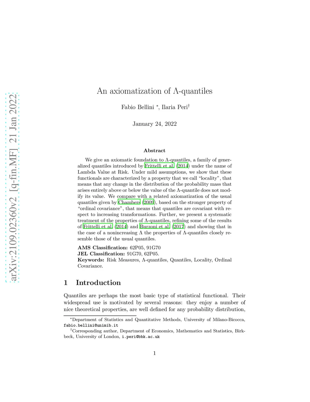 We give an axiomatic foundation to -quantiles, a family of generalized quantiles introduced by Frittelli et al. (2014) under the name of Lambda Value at Risk. Under mild assumptions, we show that these functionals are characterized by a property that we call "locality", that means that any change in the distribution of the probability mass that arises entirely above or below the value of the -quantile does not modify its value. We compare with a related axiomatization of the usual quantiles given by Chambers (2009), based on the stronger property of "ordinal covariance", that means that quantiles are covariant with respect to increasing transformations. Further, we present a systematic treatment of the properties of -quantiles, refining some of the results of Frittelli et al. (2014) and Burzoni et al. (2017) and showing that in the case of a nonincreasing the properties of -quantiles closely resemble those of the usual quantiles.