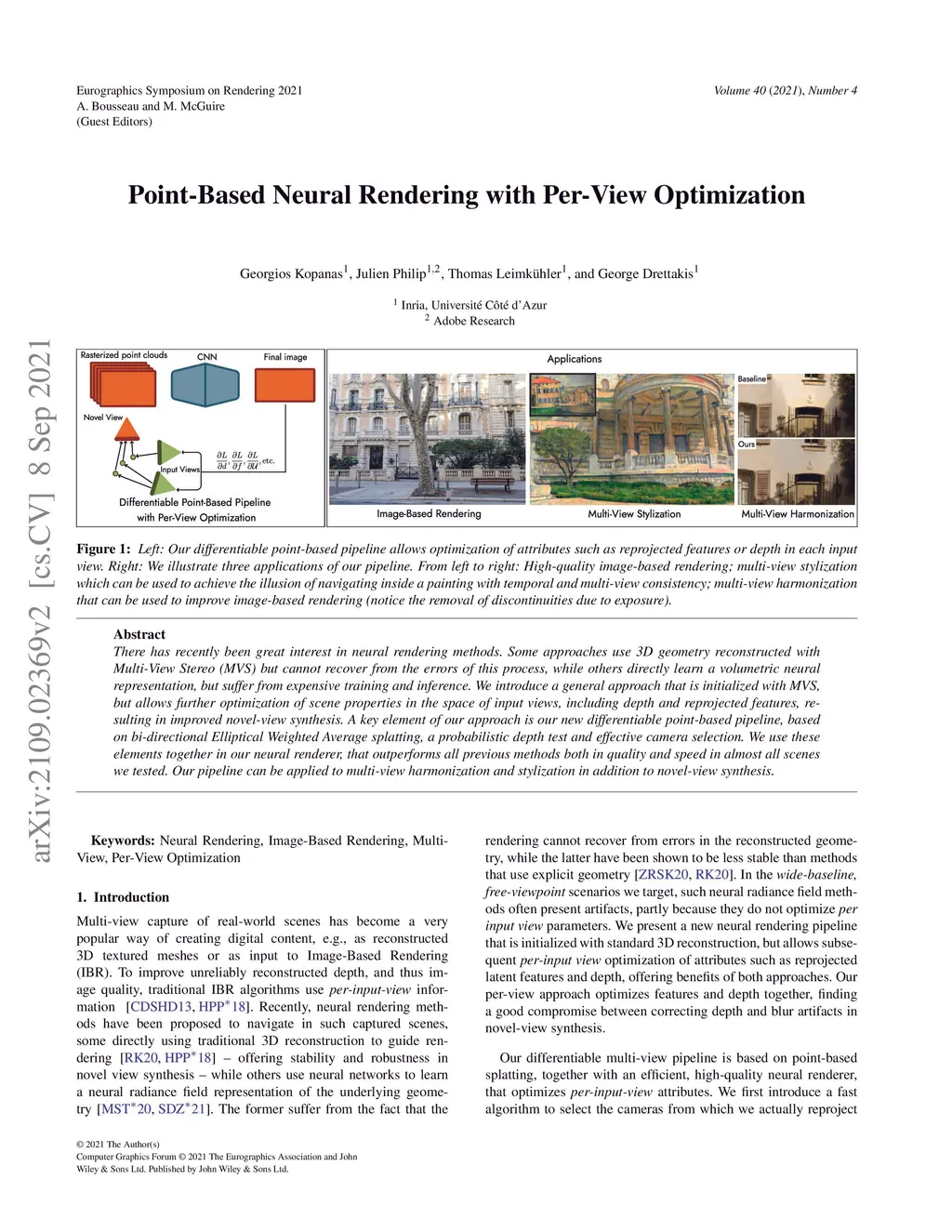 There has recently been great interest in neural rendering methods. Some approaches use 3D geometry reconstructed with Multi-View Stereo (MVS) but cannot recover from the errors of this process, while others directly learn a volumetric neural representation, but suffer from expensive training and inference. We introduce a general approach that is initialized with MVS, but allows further optimization of scene properties in the space of input views, including depth and reprojected features, resulting in improved novel-view synthesis. A key element of our approach is our new differentiable point-based pipeline, based on bi-directional Elliptical Weighted Average splatting, a probabilistic depth test and effective camera selection. We use these elements together in our neural renderer, that outperforms all previous methods both in quality and speed in almost all scenes we tested. Our pipeline can be applied to multi-view harmonization and stylization in addition to novel-view synthesis.