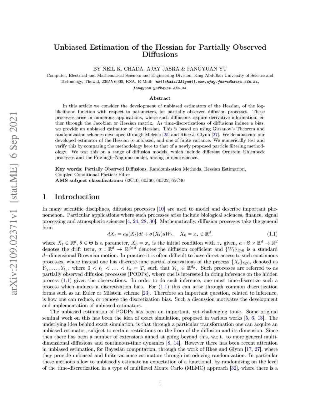 In this article we consider the development of unbiased estimators of the Hessian, of the log-likelihood function with respect to parameters, for partially observed diffusion processes. These processes arise in numerous applications, where such diffusions require derivative information, either through the Jacobian or Hessian matrix. As time-discretizations of diffusions induce a bias, we provide an unbiased estimator of the Hessian. This is based on using Girsanov's Theorem and randomization schemes developed through Mcleish [2011] and Rhee & Glynn [2015]. We demonstrate our developed estimator of the Hessian is unbiased, and one of finite variance. We numerically test and verify this by comparing the methodology here to that of a newly proposed particle filtering methodology. We test this on a range of diffusion models, which include different Ornstein--Uhlenbeck processes and the Fitzhugh--Nagumo model, arising in neuroscience.