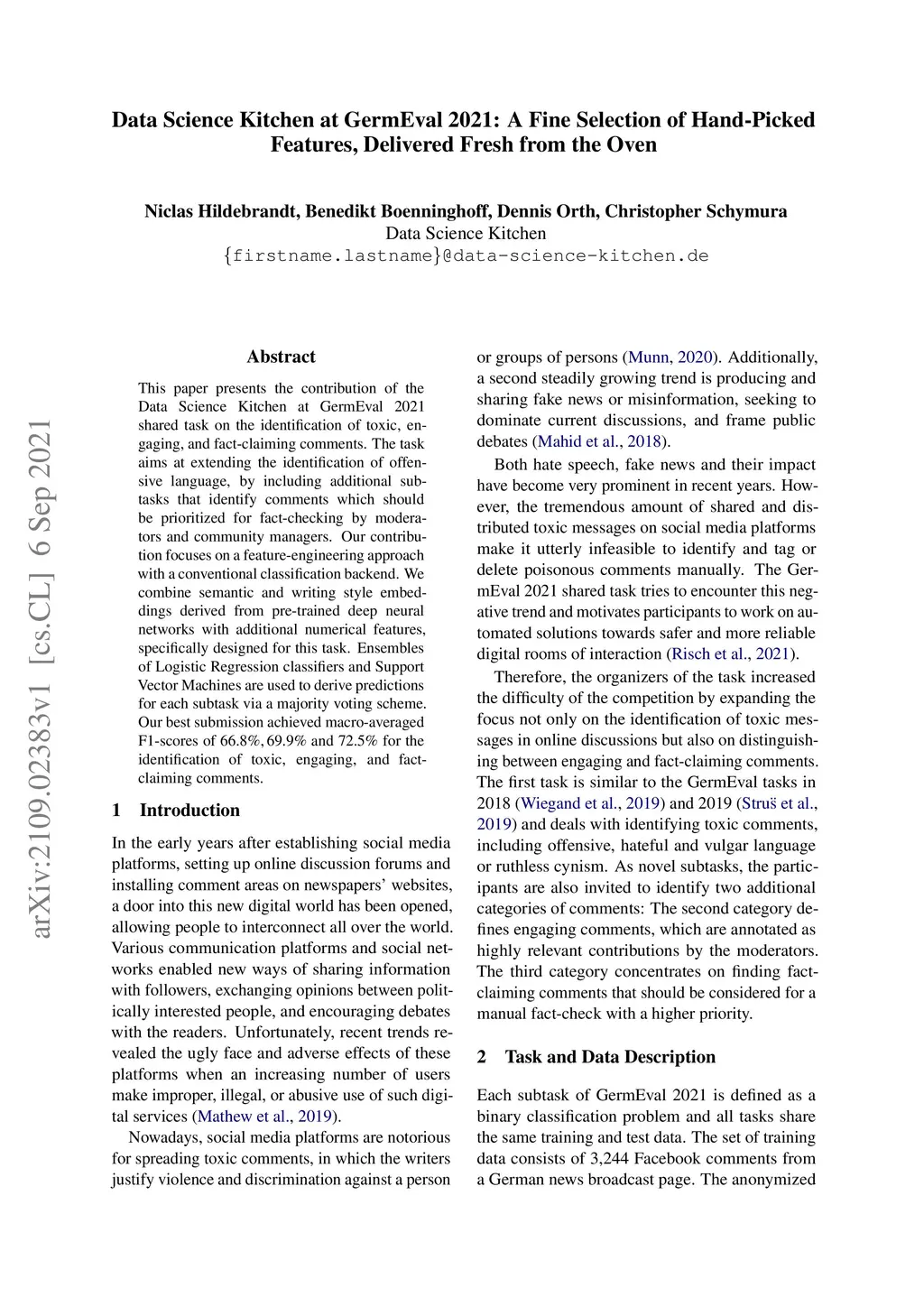 This paper presents the contribution of the Data Science Kitchen at GermEval 2021 shared task on the identification of toxic, engaging, and fact-claiming comments. The task aims at extending the identification of offensive language, by including additional subtasks that identify comments which should be prioritized for fact-checking by moderators and community managers. Our contribution focuses on a feature-engineering approach with a conventional classification backend. We combine semantic and writing style embeddings derived from pre-trained deep neural networks with additional numerical features, specifically designed for this task. Ensembles of Logistic Regression classifiers and Support Vector Machines are used to derive predictions for each subtask via a majority voting scheme. Our best submission achieved macro-averaged F1-scores of 66.8%, 69.9% and 72.5% for the identification of toxic, engaging, and fact-claiming comments.
