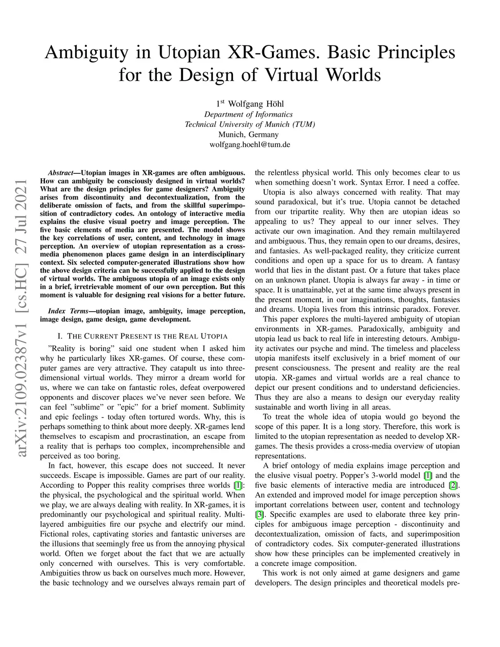 Utopian images in XR-games are often ambiguous. How can ambiguity be consciously designed in virtual worlds? What are the design principles for game designers? Ambiguity arises from discontinuity and decontextualization, from the deliberate omission of facts, and from the skillful superimposition of contradictory codes. An ontology of interactive media explains the elusive visual poetry and image perception. The five basic elements of media are presented. The model shows the key correlations of user, content, and technology in image perception. An overview of utopian representation as a cross-media phenomenon places game design in an interdisciplinary context. Six selected computer-generated illustrations show how the above design criteria can be successfully applied to the design of virtual worlds. The ambiguous utopia of an image exists only in a brief, irretrievable moment of our own perception. But this moment is valuable for designing real visions for a better future.