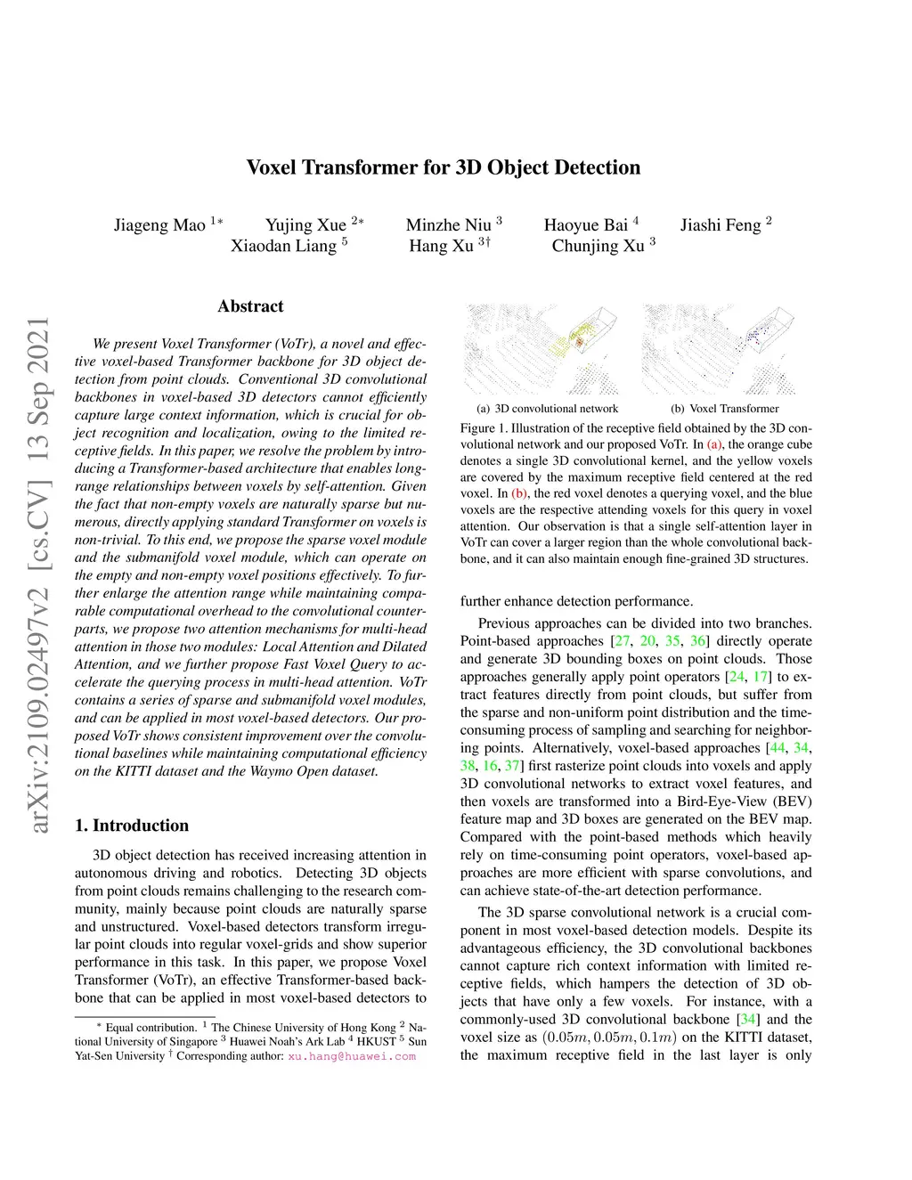 We present Voxel Transformer (VoTr), a novel and effective voxel-based Transformer backbone for 3D object detection from point clouds. Conventional 3D convolutional backbones in voxel-based 3D detectors cannot efficiently capture large context information, which is crucial for object recognition and localization, owing to the limited receptive fields. In this paper, we resolve the problem by introducing a Transformer-based architecture that enables long-range relationships between voxels by self-attention. Given the fact that non-empty voxels are naturally sparse but numerous, directly applying standard Transformer on voxels is non-trivial. To this end, we propose the sparse voxel module and the submanifold voxel module, which can operate on the empty and non-empty voxel positions effectively. To further enlarge the attention range while maintaining comparable computational overhead to the convolutional counterparts, we propose two attention mechanisms for multi-head attention in those two modules: Local Attention and Dilated Attention, and we further propose Fast Voxel Query to accelerate the querying process in multi-head attention. VoTr contains a series of sparse and submanifold voxel modules and can be applied in most voxel-based detectors. Our proposed VoTr shows consistent improvement over the convolutional baselines while maintaining computational efficiency on the KITTI dataset and the Waymo Open dataset.
