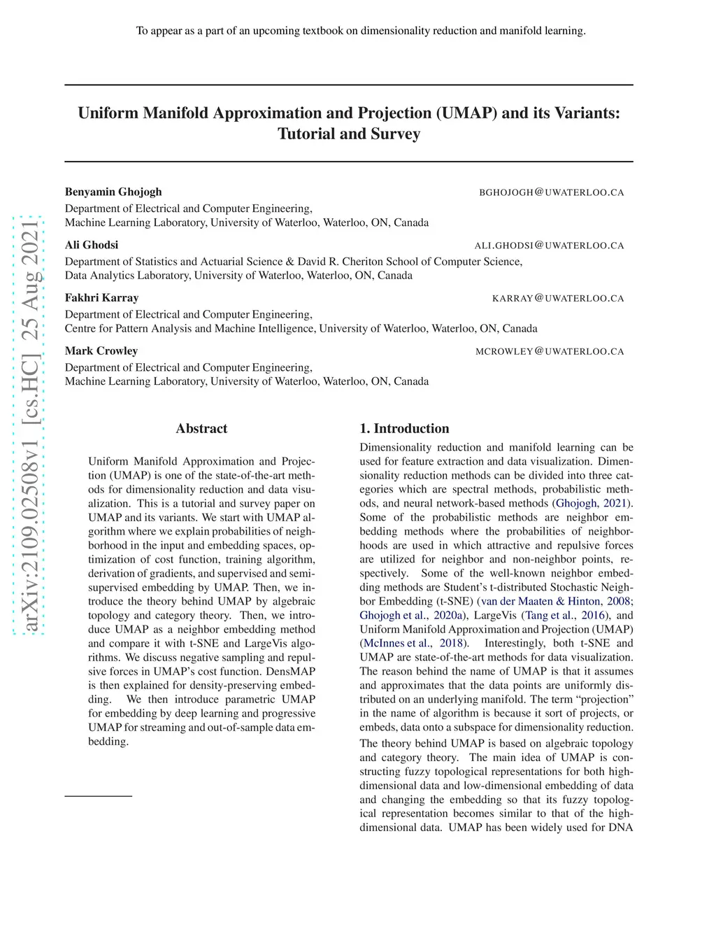 Uniform Manifold Approximation and Projection (UMAP) is one of the state-of-the-art methods for dimensionality reduction and data visualization. This is a tutorial and survey paper on UMAP and its variants. We start with UMAP algorithm where we explain probabilities of neighborhood in the input and embedding spaces, optimization of cost function, training algorithm, derivation of gradients, and supervised and semi-supervised embedding by UMAP. Then, we introduce the theory behind UMAP by algebraic topology and category theory. Then, we introduce UMAP as a neighbor embedding method and compare it with t-SNE and LargeVis algorithms. We discuss negative sampling and repulsive forces in UMAP's cost function. DensMAP is then explained for density-preserving embedding. We then introduce parametric UMAP for embedding by deep learning and progressive UMAP for streaming and out-of-sample data embedding.