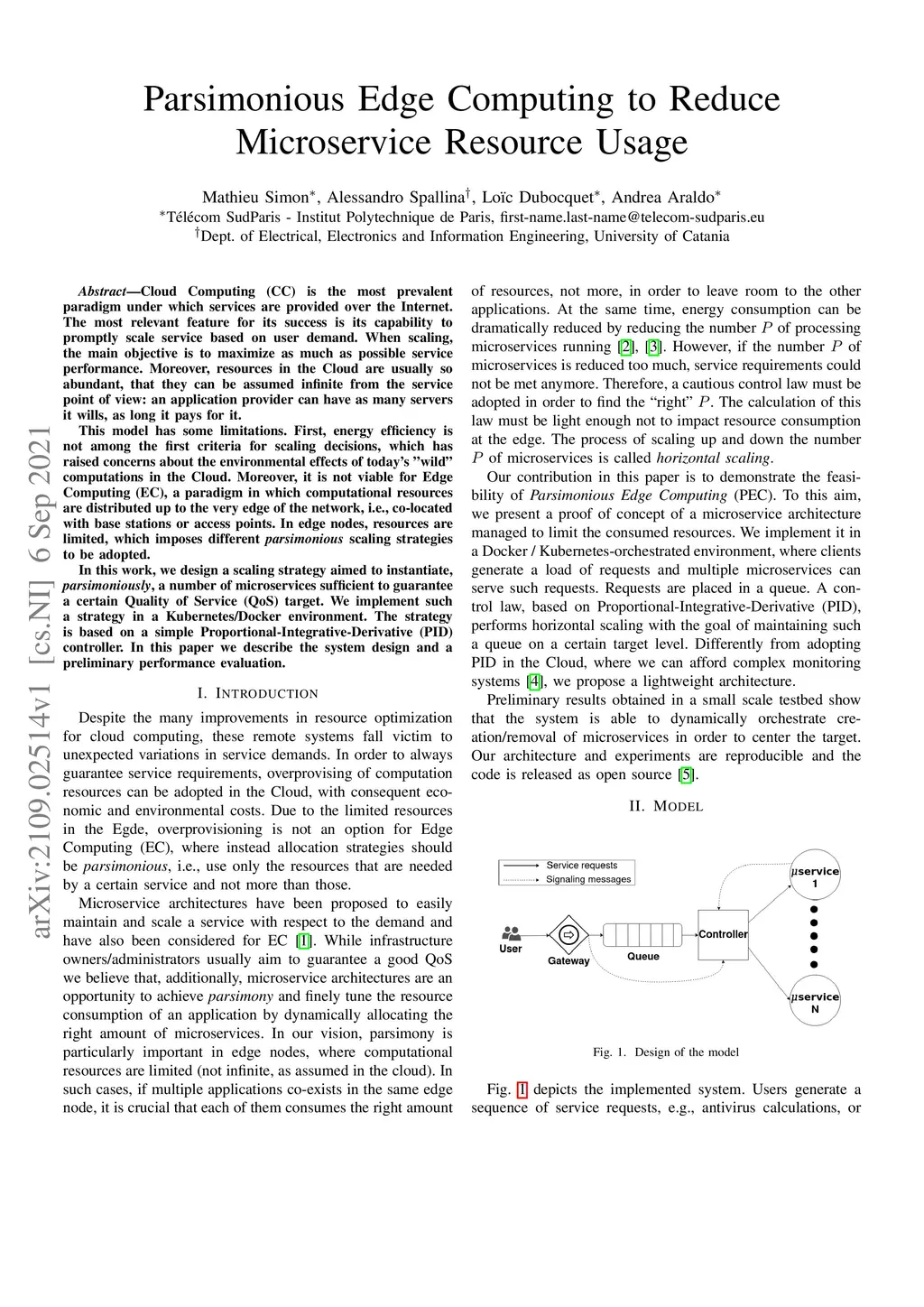 Cloud Computing (CC) is the most prevalent paradigm under which services are provided over the Internet. The most relevant feature for its success is its capability to promptly scale service based on user demand. When scaling, the main objective is to maximize as much as possible service performance. Moreover, resources in the Cloud are usually so abundant, that they can be assumed infinite from the service point of view: an application provider can have as many servers it wills, as long it pays for it. This model has some limitations. First, energy efficiency is not among the first criteria for scaling decisions, which has raised concerns about the environmental effects of today's wild computations in the Cloud. Moreover, it is not viable for Edge Computing (EC), a paradigm in which computational resources are distributed up to the very edge of the network, i.e., co-located with base stations or access points. In edge nodes, resources are limited, which imposes different parsimonious scaling strategies to be adopted. In this work, we design a scaling strategy aimed to instantiate, parsimoniously, a number of microservices sufficient to guarantee a certain Quality of Service (QoS) target. We implement such a strategy in a Kubernetes/Docker environment. The strategy is based on a simple Proportional-Integrative-Derivative (PID) controller. In this paper we describe the system design and a preliminary performance evaluation.
