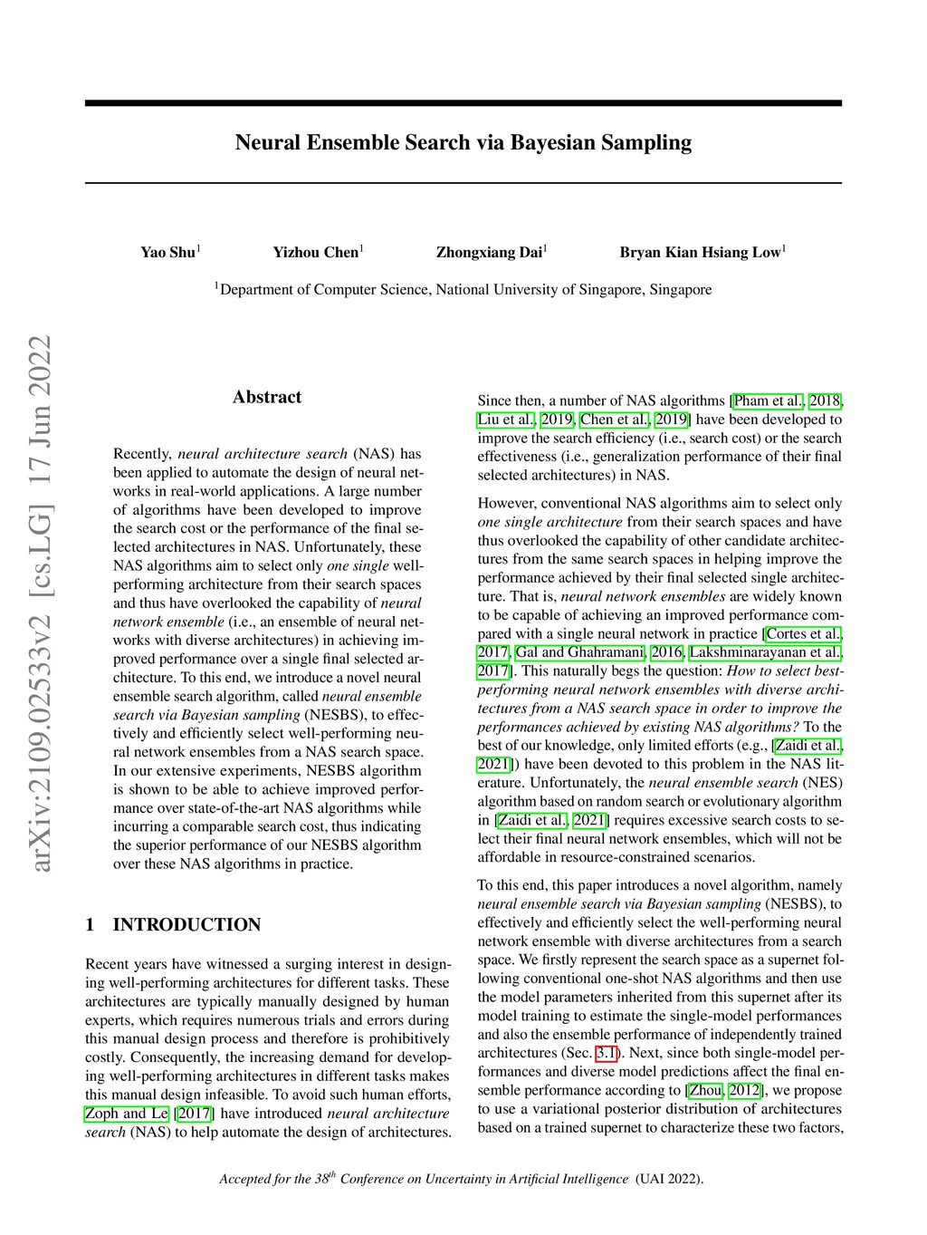 Recently, neural architecture search (NAS) has been applied to automate the design of neural networks in real-world applications. A large number of algorithms have been developed to improve the search cost or the performance of the final selected architectures in NAS. Unfortunately, these NAS algorithms aim to select only one single well-performing architecture from their search spaces and thus have overlooked the capability of neural network ensemble (i.e., an ensemble of neural networks with diverse architectures) in achieving improved performance over a single final selected architecture. To this end, we introduce a novel neural ensemble search algorithm, called neural ensemble search via Bayesian sampling (NESBS), to effectively and efficiently select well-performing neural network ensembles from a NAS search space. In our extensive experiments, NESBS algorithm is shown to be able to achieve improved performance over state-of-the-art NAS algorithms while incurring a comparable search cost, thus indicating the superior performance of our NESBS algorithm over these NAS algorithms in practice.