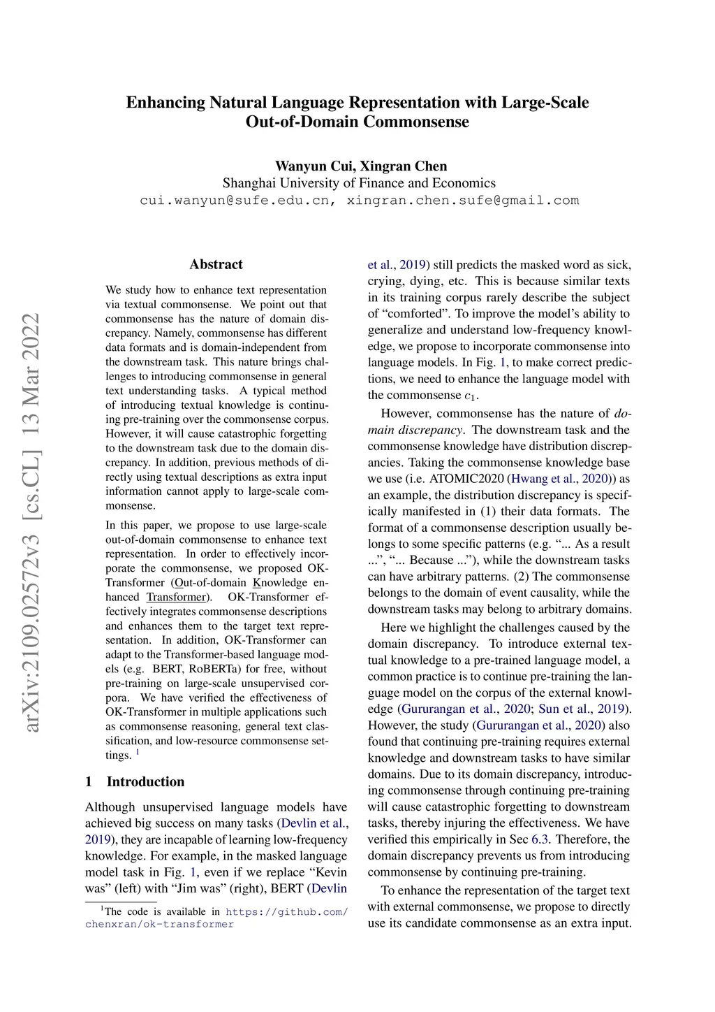 We study how to enhance text representation via textual commonsense. We point out that commonsense has the nature of domain discrepancy. Namely, commonsense has different data formats and is domain-independent from the downstream task. This nature brings challenges to introducing commonsense in general text understanding tasks. A typical method of introducing textual knowledge is continuing pre-training over the commonsense corpus. However, it will cause catastrophic forgetting to the downstream task due to the domain discrepancy. In addition, previous methods of directly using textual descriptions as extra input information cannot apply to large-scale commonsense. In this paper, we propose to use large-scale out-of-domain commonsense to enhance text representation. In order to effectively incorporate the commonsense, we proposed OK-Transformer (\underline{O}ut-of-domain \underline{K}nowledge enhanced \underline{Transformer}). OK-Transformer effectively integrates commonsense descriptions and enhances them to the target text representation. In addition, OK-Transformer can adapt to the Transformer-based language models (e.g. BERT, RoBERTa) for free, without pre-training on large-scale unsupervised corpora. We have verified the effectiveness of OK-Transformer in multiple applications such as commonsense reasoning, general text classification, and low-resource commonsense settings.