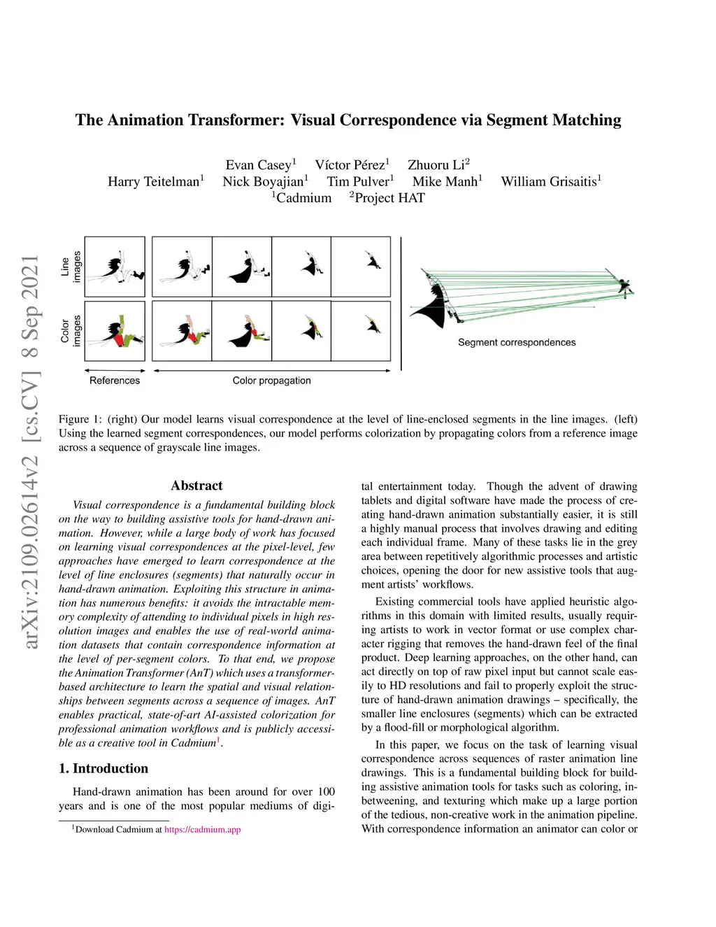 Visual correspondence is a fundamental building block on the way to building assistive tools for hand-drawn animation. However, while a large body of work has focused on learning visual correspondences at the pixel-level, few approaches have emerged to learn correspondence at the level of line enclosures (segments) that naturally occur in hand-drawn animation. Exploiting this structure in animation has numerous benefits: it avoids the intractable memory complexity of attending to individual pixels in high resolution images and enables the use of real-world animation datasets that contain correspondence information at the level of per-segment colors. To that end, we propose the Animation Transformer (AnT) which uses a transformer-based architecture to learn the spatial and visual relationships between segments across a sequence of images. AnT enables practical ML-assisted colorization for professional animation workflows and is publicly accessible as a creative tool in Cadmium.