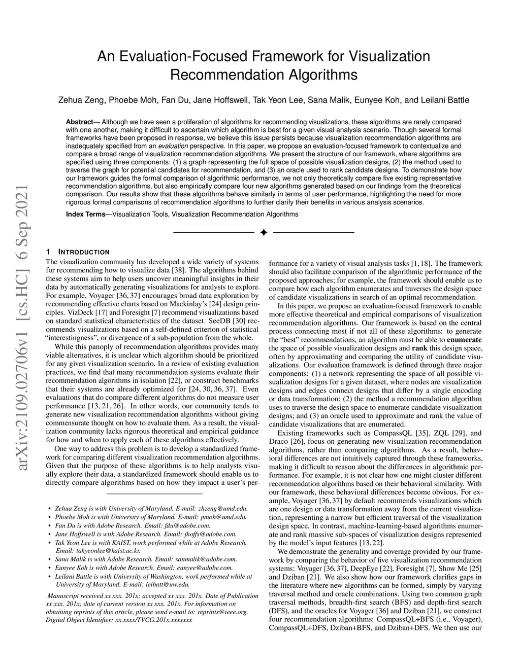 Although we have seen a proliferation of algorithms for recommending visualizations, these algorithms are rarely compared with one another, making it difficult to ascertain which algorithm is best for a given visual analysis scenario. Though several formal frameworks have been proposed in response, we believe this issue persists because visualization recommendation algorithms are inadequately specified from an evaluation perspective. In this paper, we propose an evaluation-focused framework to contextualize and compare a broad range of visualization recommendation algorithms. We present the structure of our framework, where algorithms are specified using three components: (1) a graph representing the full space of possible visualization designs, (2) the method used to traverse the graph for potential candidates for recommendation, and (3) an oracle used to rank candidate designs. To demonstrate how our framework guides the formal comparison of algorithmic performance, we not only theoretically compare five existing representative recommendation algorithms, but also empirically compare four new algorithms generated based on our findings from the theoretical comparison. Our results show that these algorithms behave similarly in terms of user performance, highlighting the need for more rigorous formal comparisons of recommendation algorithms to further clarify their benefits in various analysis scenarios.