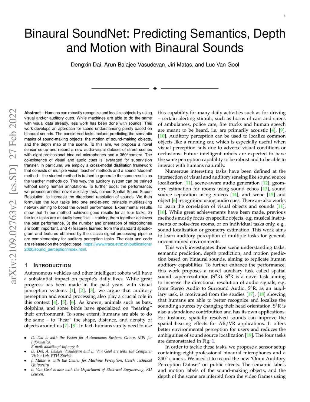 Humans can robustly recognize and localize objects by using visual and/or auditory cues. While machines are able to do the same with visual data already, less work has been done with sounds. This work develops an approach for scene understanding purely based on binaural sounds. The considered tasks include predicting the semantic masks of sound-making objects, the motion of sound-making objects, and the depth map of the scene. To this aim, we propose a novel sensor setup and record a new audio-visual dataset of street scenes with eight professional binaural microphones and a 360-degree camera. The co-existence of visual and audio cues is leveraged for supervision transfer. In particular, we employ a cross-modal distillation framework that consists of multiple vision teacher methods and a sound student method -- the student method is trained to generate the same results as the teacher methods do. This way, the auditory system can be trained without using human annotations. To further boost the performance, we propose another novel auxiliary task, coined Spatial Sound Super-Resolution, to increase the directional resolution of sounds. We then formulate the four tasks into one end-to-end trainable multi-tasking network aiming to boost the overall performance. Experimental results show that 1) our method achieves good results for all four tasks, 2) the four tasks are mutually beneficial -- training them together achieves the best performance, 3) the number and orientation of microphones are both important, and 4) features learned from the standard spectrogram and features obtained by the classic signal processing pipeline are complementary for auditory perception tasks. The data and code are released.