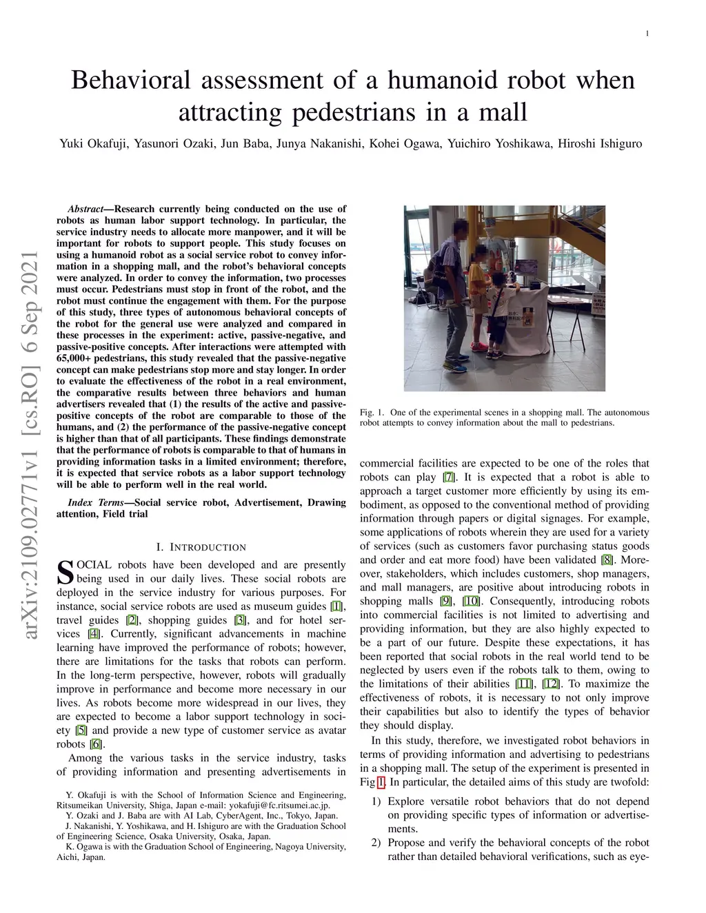 Research currently being conducted on the use of robots as human labor support technology. In particular, the service industry needs to allocate more manpower, and it will be important for robots to support people. This study focuses on using a humanoid robot as a social service robot to convey information in a shopping mall, and the robot's behavioral concepts were analyzed. In order to convey the information, two processes must occur. Pedestrians must stop in front of the robot, and the robot must continue the engagement with them. For the purpose of this study, three types of autonomous behavioral concepts of the robot for the general use were analyzed and compared in these processes in the experiment: active, passive-negative, and passive-positive concepts. After interactions were attempted with 65,000+ pedestrians, this study revealed that the passive-negative concept can make pedestrians stop more and stay longer. In order to evaluate the effectiveness of the robot in a real environment, the comparative results between three behaviors and human advertisers revealed that (1) the results of the active and passive-positive concepts of the robot are comparable to those of the humans, and (2) the performance of the passive-negative concept is higher than that of all participants. These findings demonstrate that the performance of robots is comparable to that of humans in providing information tasks in a limited environment; therefore, it is expected that service robots as a labor support technology will be able to perform well in the real world.