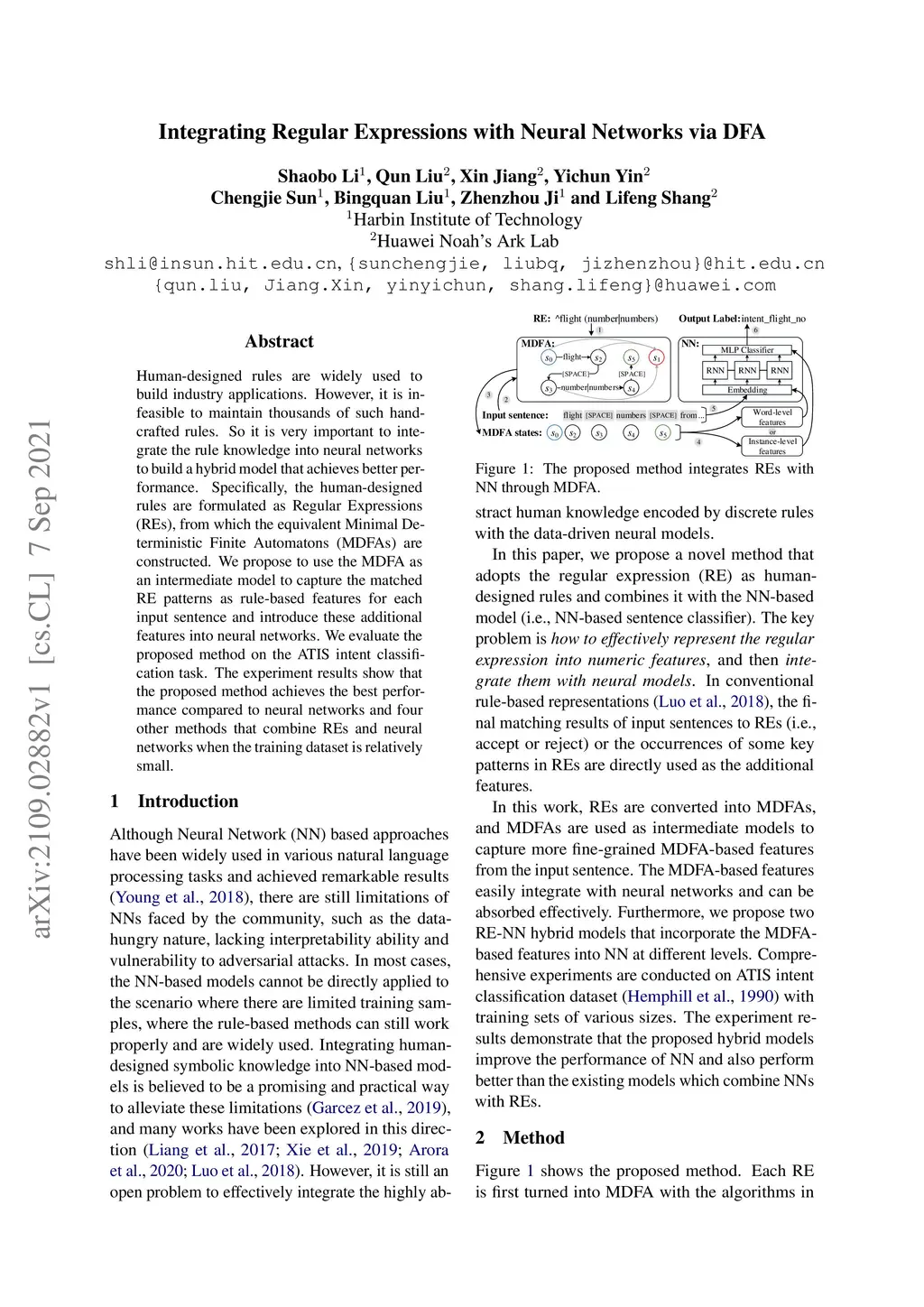Human-designed rules are widely used to build industry applications. However, it is infeasible to maintain thousands of such hand-crafted rules. So it is very important to integrate the rule knowledge into neural networks to build a hybrid model that achieves better performance. Specifically, the human-designed rules are formulated as Regular Expressions (REs), from which the equivalent Minimal Deterministic Finite Automatons (MDFAs) are constructed. We propose to use the MDFA as an intermediate model to capture the matched RE patterns as rule-based features for each input sentence and introduce these additional features into neural networks. We evaluate the proposed method on the ATIS intent classification task. The experiment results show that the proposed method achieves the best performance compared to neural networks and four other methods that combine REs and neural networks when the training dataset is relatively small.