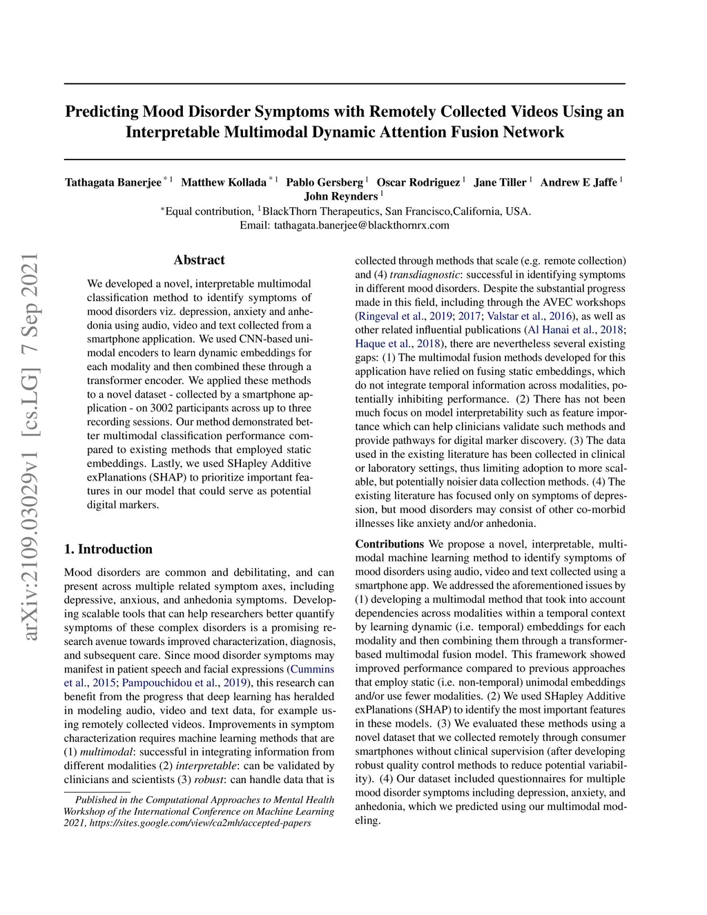 We developed a novel, interpretable multimodal classification method to identify symptoms of mood disorders viz. depression, anxiety and anhedonia using audio, video and text collected from a smartphone application. We used CNN-based unimodal encoders to learn dynamic embeddings for each modality and then combined these through a transformer encoder. We applied these methods to a novel dataset - collected by a smartphone application - on 3002 participants across up to three recording sessions. Our method demonstrated better multimodal classification performance compared to existing methods that employed static embeddings. Lastly, we used SHapley Additive exPlanations (SHAP) to prioritize important features in our model that could serve as potential digital markers.