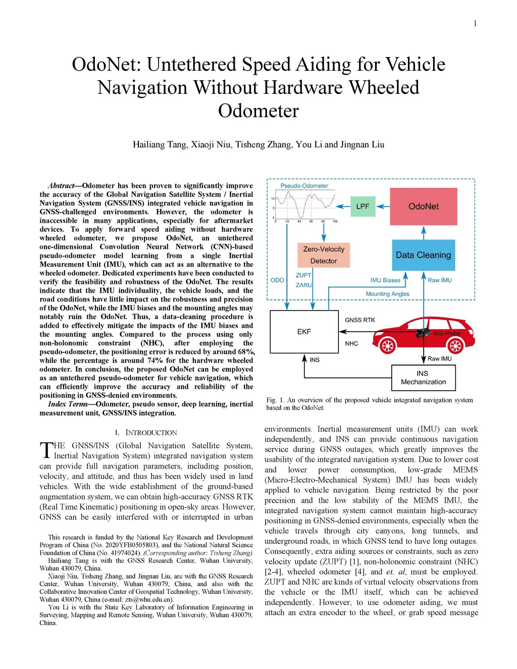 Odometer has been proven to significantly improve the accuracy of the Global Navigation Satellite System / Inertial Navigation System (GNSS/INS) integrated vehicle navigation in GNSS-challenged environments. However, the odometer is inaccessible in many applications, especially for aftermarket devices. To apply forward speed aiding without hardware wheeled odometer, we propose OdoNet, an untethered one-dimensional Convolution Neural Network (CNN)-based pseudo-odometer model learning from a single Inertial Measurement Unit (IMU), which can act as an alternative to the wheeled odometer. Dedicated experiments have been conducted to verify the feasibility and robustness of the OdoNet. The results indicate that the IMU individuality, the vehicle loads, and the road conditions have little impact on the robustness and precision of the OdoNet, while the IMU biases and the mounting angles may notably ruin the OdoNet. Thus, a data-cleaning procedure is added to effectively mitigate the impacts of the IMU biases and the mounting angles. Compared to the process using only non-holonomic constraint (NHC), after employing the pseudo-odometer, the positioning error is reduced by around 68%, while the percentage is around 74% for the hardware wheeled odometer. In conclusion, the proposed OdoNet can be employed as an untethered pseudo-odometer for vehicle navigation, which can efficiently improve the accuracy and reliability of the positioning in GNSS-denied environments.