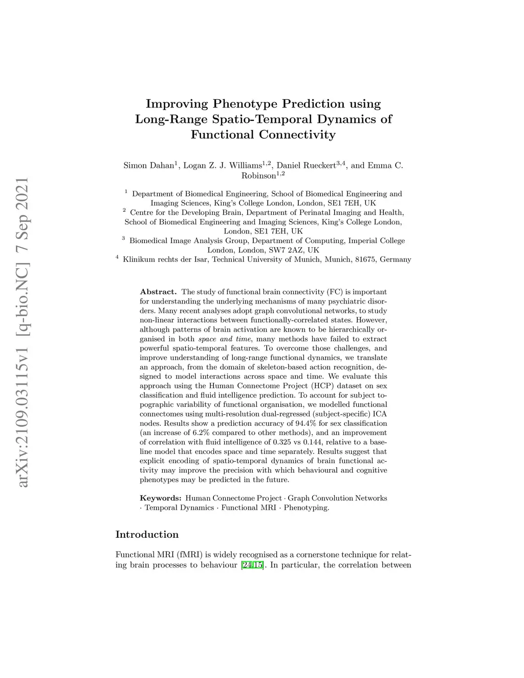 The study of functional brain connectivity (FC) is important for understanding the underlying mechanisms of many psychiatric disorders. Many recent analyses adopt graph convolutional networks, to study non-linear interactions between functionally-correlated states. However, although patterns of brain activation are known to be hierarchically organised in both space and time, many methods have failed to extract powerful spatio-temporal features. To overcome those challenges, and improve understanding of long-range functional dynamics, we translate an approach, from the domain of skeleton-based action recognition, designed to model interactions across space and time. We evaluate this approach using the Human Connectome Project (HCP) dataset on sex classification and fluid intelligence prediction. To account for subject topographic variability of functional organisation, we modelled functional connectomes using multi-resolution dual-regressed (subject-specific) ICA nodes. Results show a prediction accuracy of 94.4% for sex classification (an increase of 6.2% compared to other methods), and an improvement of correlation with fluid intelligence of 0.325 vs 0.144, relative to a baseline model that encodes space and time separately. Results suggest that explicit encoding of spatio-temporal dynamics of brain functional activity may improve the precision with which behavioural and cognitive phenotypes may be predicted in the future.