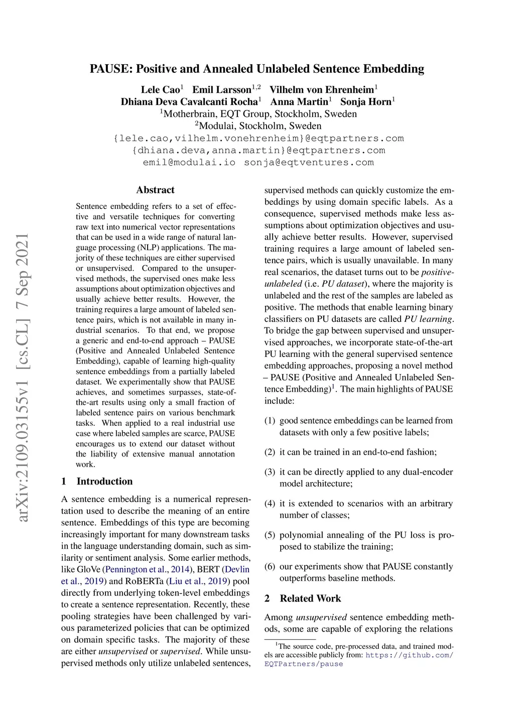 Sentence embedding refers to a set of effective and versatile techniques for converting raw text into numerical vector representations that can be used in a wide range of natural language processing (NLP) applications. The majority of these techniques are either supervised or unsupervised. Compared to the unsupervised methods, the supervised ones make less assumptions about optimization objectives and usually achieve better results. However, the training requires a large amount of labeled sentence pairs, which is not available in many industrial scenarios. To that end, we propose a generic and end-to-end approach -- PAUSE (Positive and Annealed Unlabeled Sentence Embedding), capable of learning high-quality sentence embeddings from a partially labeled dataset. We experimentally show that PAUSE achieves, and sometimes surpasses, state-of-the-art results using only a small fraction of labeled sentence pairs on various benchmark tasks. When applied to a real industrial use case where labeled samples are scarce, PAUSE encourages us to extend our dataset without the liability of extensive manual annotation work.