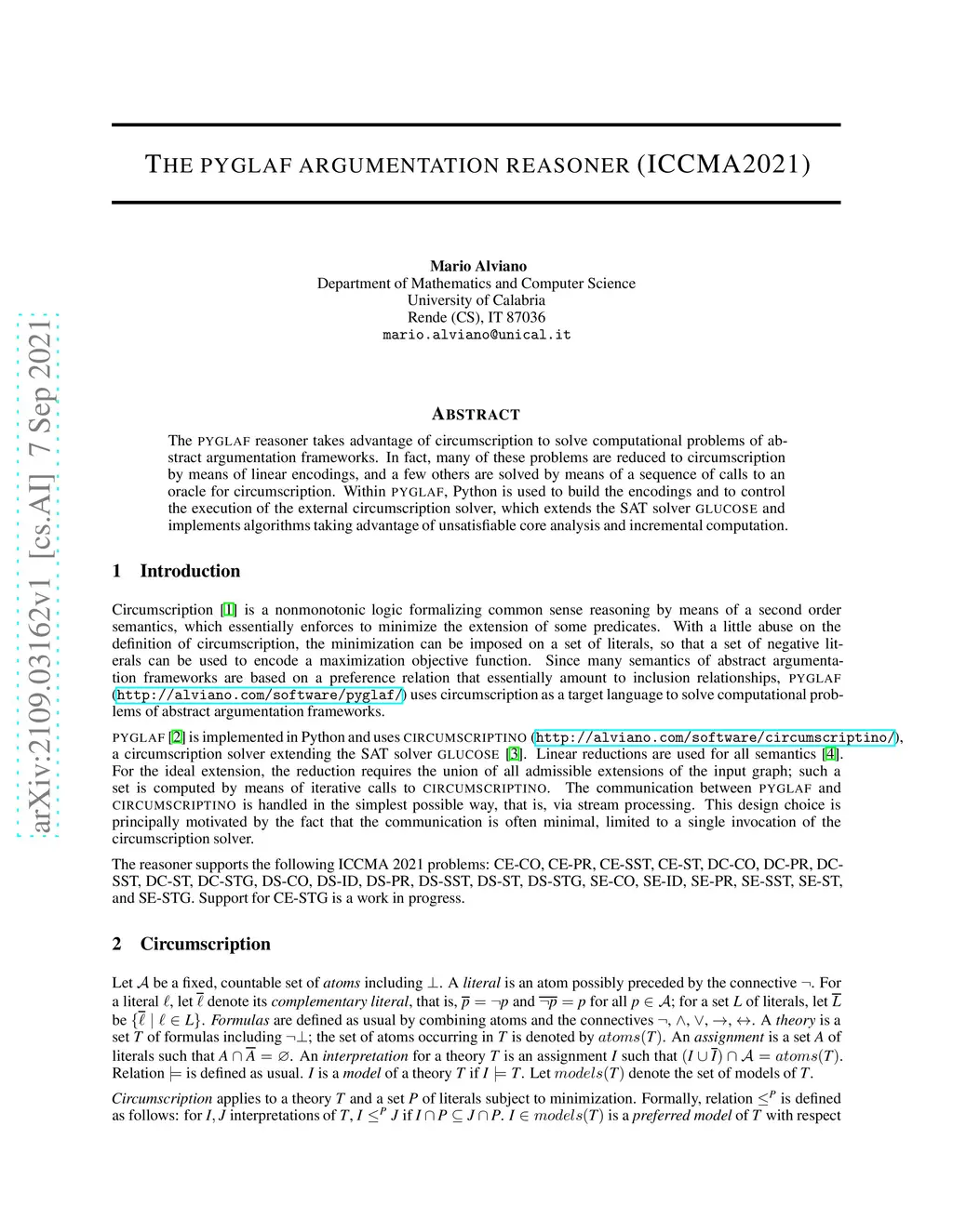 The pyglaf reasoner takes advantage of circumscription to solve computational problems of abstract argumentation frameworks. In fact, many of these problems are reduced to circumscription by means of linear encodings, and a few others are solved by means of a sequence of calls to an oracle for circumscription. Within pyglaf, Python is used to build the encodings and to control the execution of the external circumscription solver, which extends the SAT solver glucose and implements algorithms taking advantage of unsatisfiable core analysis and incremental computation.