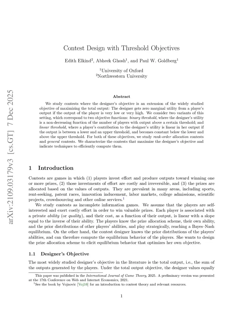 We study contests where the designer's objective is an extension of the widely studied objective of maximizing the total output: The designer gets zero marginal utility from a player's output if the output of the player is very low or very high. We consider two variants of this setting, which correspond to two objective functions: binary threshold, where the designer's utility is a non-decreasing function of the number of players with output above a certain threshold; and linear threshold, where a player's contribution to the designer's utility is linear in her output if the output is between a lower and an upper threshold, and becomes constant below the lower and above the upper threshold. For both of these objectives, we study rank-order allocation contests and general contests. We characterize the contests that maximize the designer's objective and indicate techniques to efficiently compute them.