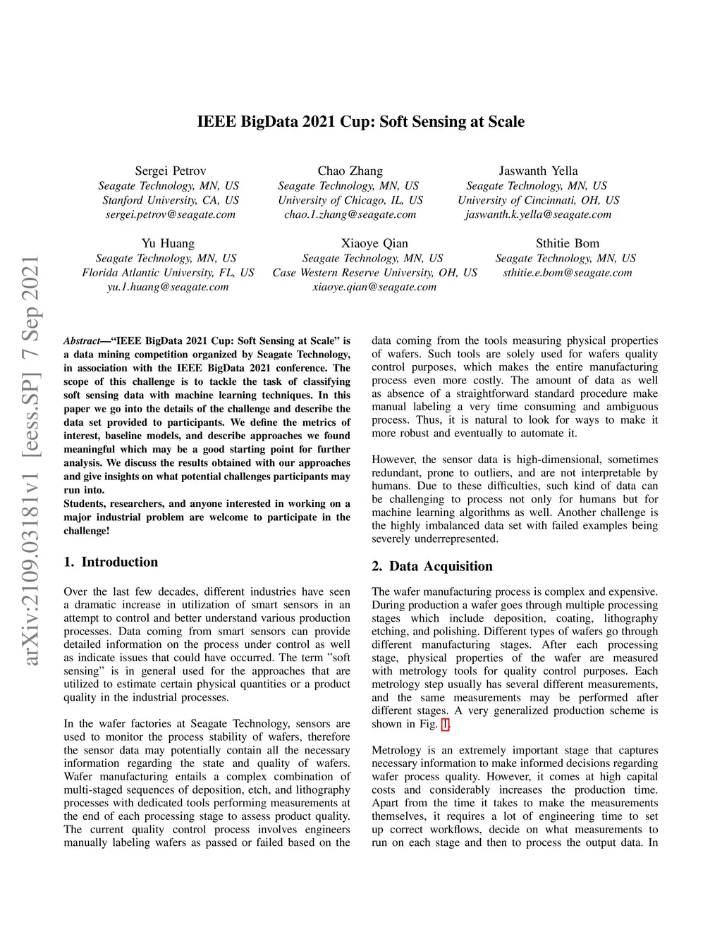 IEEE BigData 2021 Cup: Soft Sensing at Scale is a data mining competition organized by Seagate Technology, in association with the IEEE BigData 2021 conference. The scope of this challenge is to tackle the task of classifying soft sensing data with machine learning techniques. In this paper we go into the details of the challenge and describe the data set provided to participants. We define the metrics of interest, baseline models, and describe approaches we found meaningful which may be a good starting point for further analysis. We discuss the results obtained with our approaches and give insights on what potential challenges participants may run into. Students, researchers, and anyone interested in working on a major industrial problem are welcome to participate in the challenge!