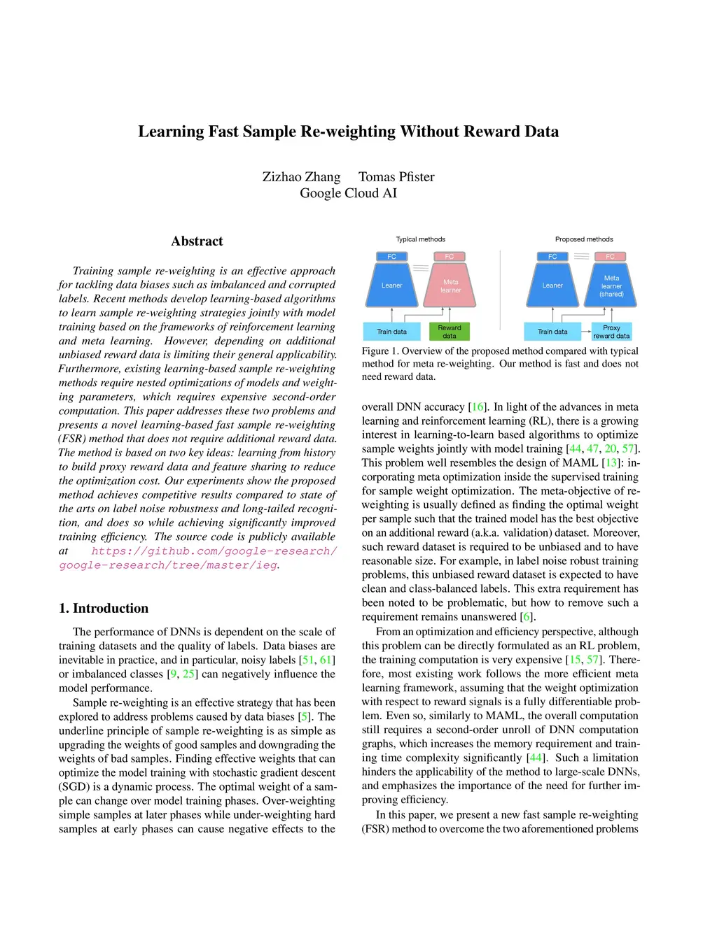 Training sample re-weighting is an effective approach for tackling data biases such as imbalanced and corrupted labels. Recent methods develop learning-based algorithms to learn sample re-weighting strategies jointly with model training based on the frameworks of reinforcement learning and meta learning. However, depending on additional unbiased reward data is limiting their general applicability. Furthermore, existing learning-based sample re-weighting methods require nested optimizations of models and weighting parameters, which requires expensive second-order computation. This paper addresses these two problems and presents a novel learning-based fast sample re-weighting (FSR) method that does not require additional reward data. The method is based on two key ideas: learning from history to build proxy reward data and feature sharing to reduce the optimization cost. Our experiments show the proposed method achieves competitive results compared to state of the arts on label noise robustness and long-tailed recognition, and does so while achieving significantly improved training efficiency. The source code is publicly available at https://github.com/google-research/google-research/tree/master/ieg.