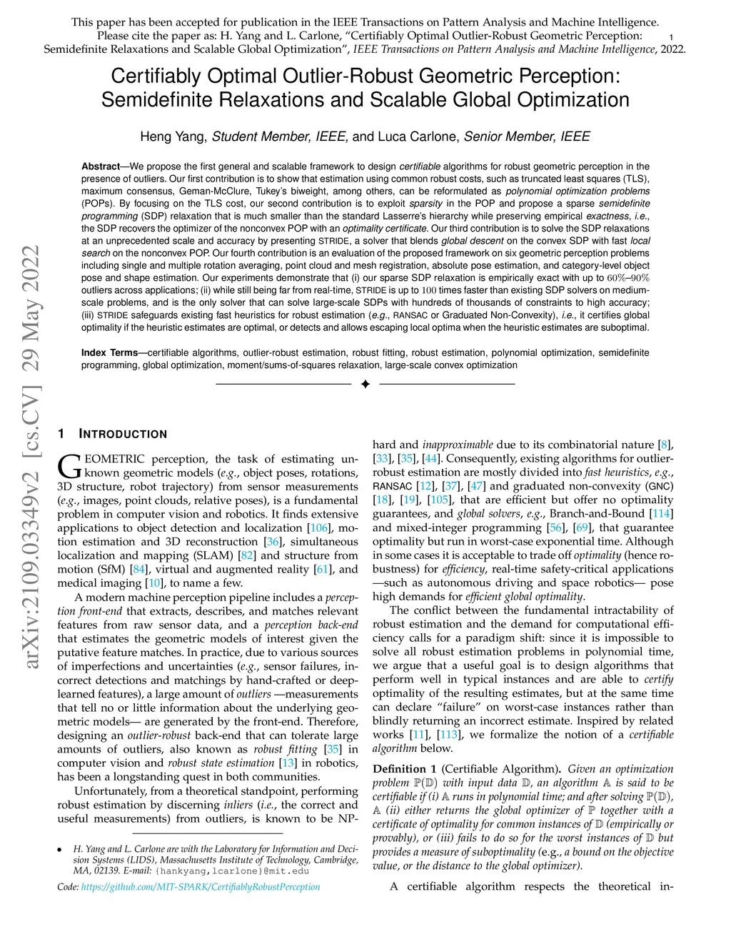 We propose the first general and scalable framework to design certifiable algorithms for robust geometric perception in the presence of outliers. Our first contribution is to show that estimation using common robust costs, such as truncated least squares (TLS), maximum consensus, Geman-McClure, Tukey's biweight, among others, can be reformulated as polynomial optimization problems (POPs). By focusing on the TLS cost, our second contribution is to exploit sparsity in the POP and propose a sparse semidefinite programming (SDP) relaxation that is much smaller than the standard Lasserre's hierarchy while preserving empirical exactness, i.e., the SDP recovers the optimizer of the nonconvex POP with an optimality certificate. Our third contribution is to solve the SDP relaxations at an unprecedented scale and accuracy by presenting STRIDE, a solver that blends global descent on the convex SDP with fast local search on the nonconvex POP. Our fourth contribution is an evaluation of the proposed framework on six geometric perception problems including single and multiple rotation averaging, point cloud and mesh registration, absolute pose estimation, and category-level object pose and shape estimation. Our experiments demonstrate that (i) our sparse SDP relaxation is empirically exact with up to 60%-90% outliers across applications; (ii) while still being far from real-time, STRIDE is up to 100 times faster than existing SDP solvers on medium-scale problems, and is the only solver that can solve large-scale SDPs with hundreds of thousands of constraints to high accuracy; (iii) STRIDE safeguards existing fast heuristics for robust estimation (e.g., RANSAC or Graduated Non-Convexity), i.e., it certifies global optimality if the heuristic estimates are optimal, or detects and allows escaping local optima when the heuristic estimates are suboptimal.