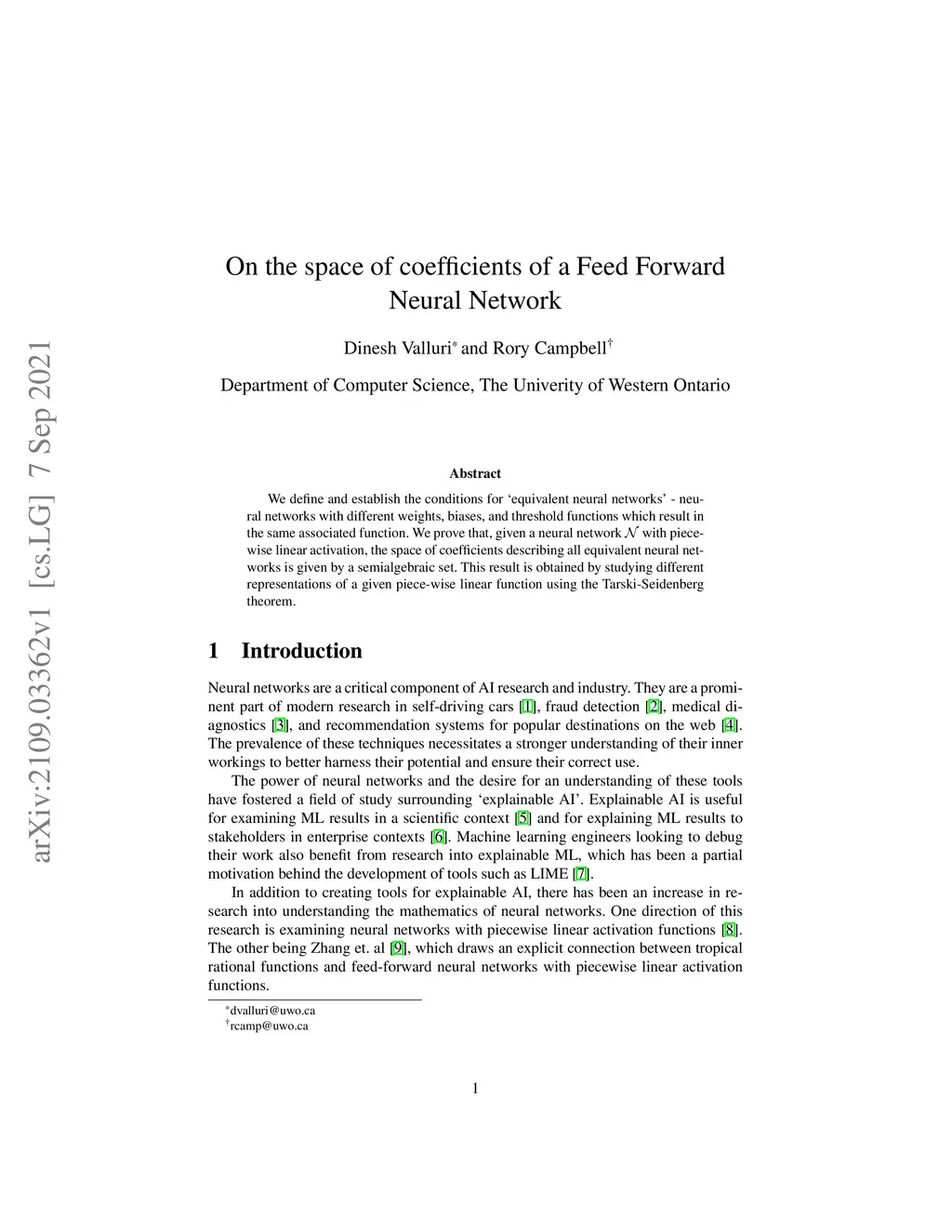 We define and establish the conditions for `equivalent neural networks' - neural networks with different weights, biases, and threshold functions that result in the same associated function. We prove that given a neural network with piece-wise linear activation, the space of coefficients describing all equivalent neural networks is given by a semialgebraic set. This result is obtained by studying different representations of a given piece-wise linear function using the Tarski-Seidenberg theorem.