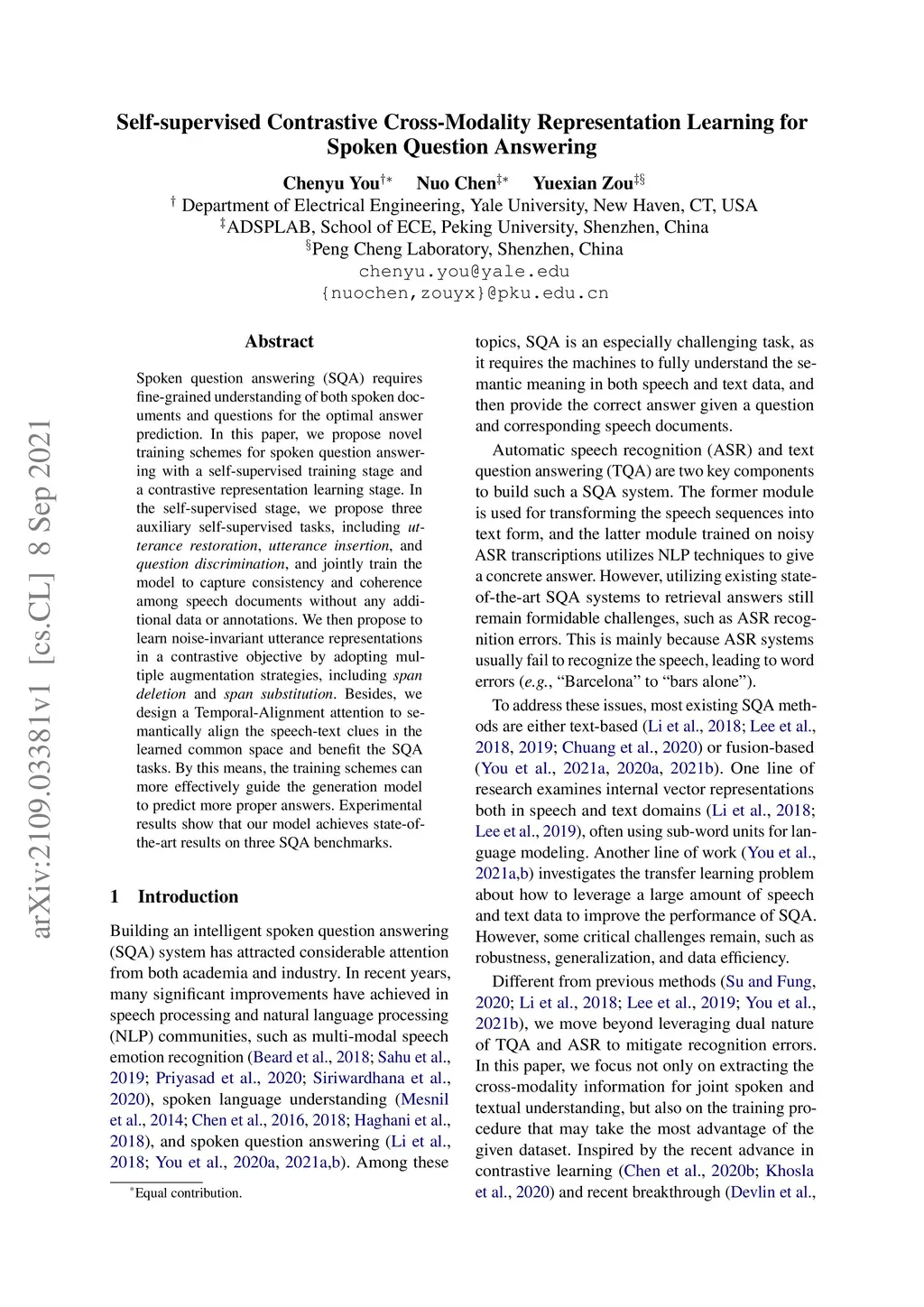 Spoken question answering (SQA) requires fine-grained understanding of both spoken documents and questions for the optimal answer prediction. In this paper, we propose novel training schemes for spoken question answering with a self-supervised training stage and a contrastive representation learning stage. In the self-supervised stage, we propose three auxiliary self-supervised tasks, including utterance restoration, utterance insertion, and question discrimination, and jointly train the model to capture consistency and coherence among speech documents without any additional data or annotations. We then propose to learn noise-invariant utterance representations in a contrastive objective by adopting multiple augmentation strategies, including span deletion and span substitution. Besides, we design a Temporal-Alignment attention to semantically align the speech-text clues in the learned common space and benefit the SQA tasks. By this means, the training schemes can more effectively guide the generation model to predict more proper answers. Experimental results show that our model achieves state-of-the-art results on three SQA benchmarks.