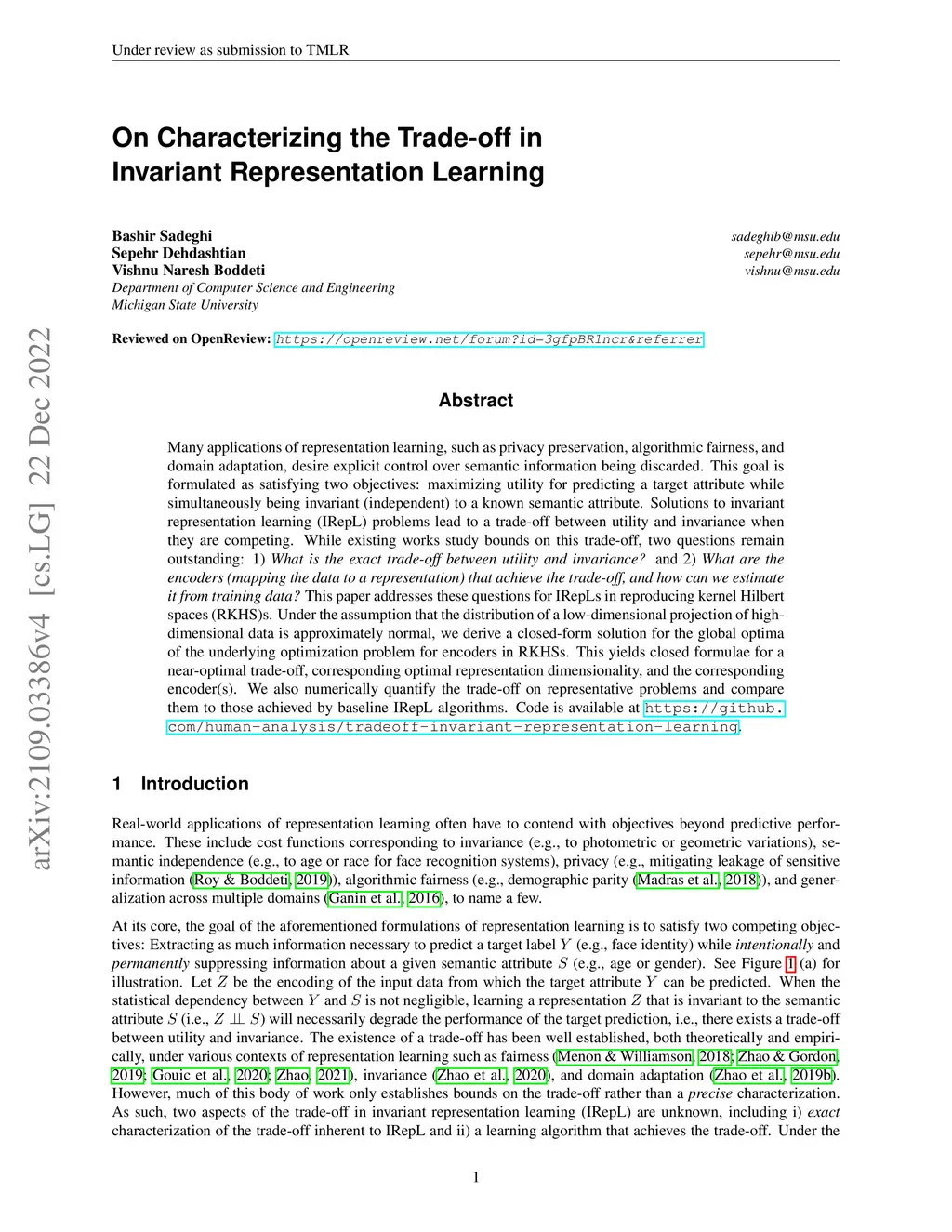 On Characterizing the Trade-off in Invariant Representation Learning
