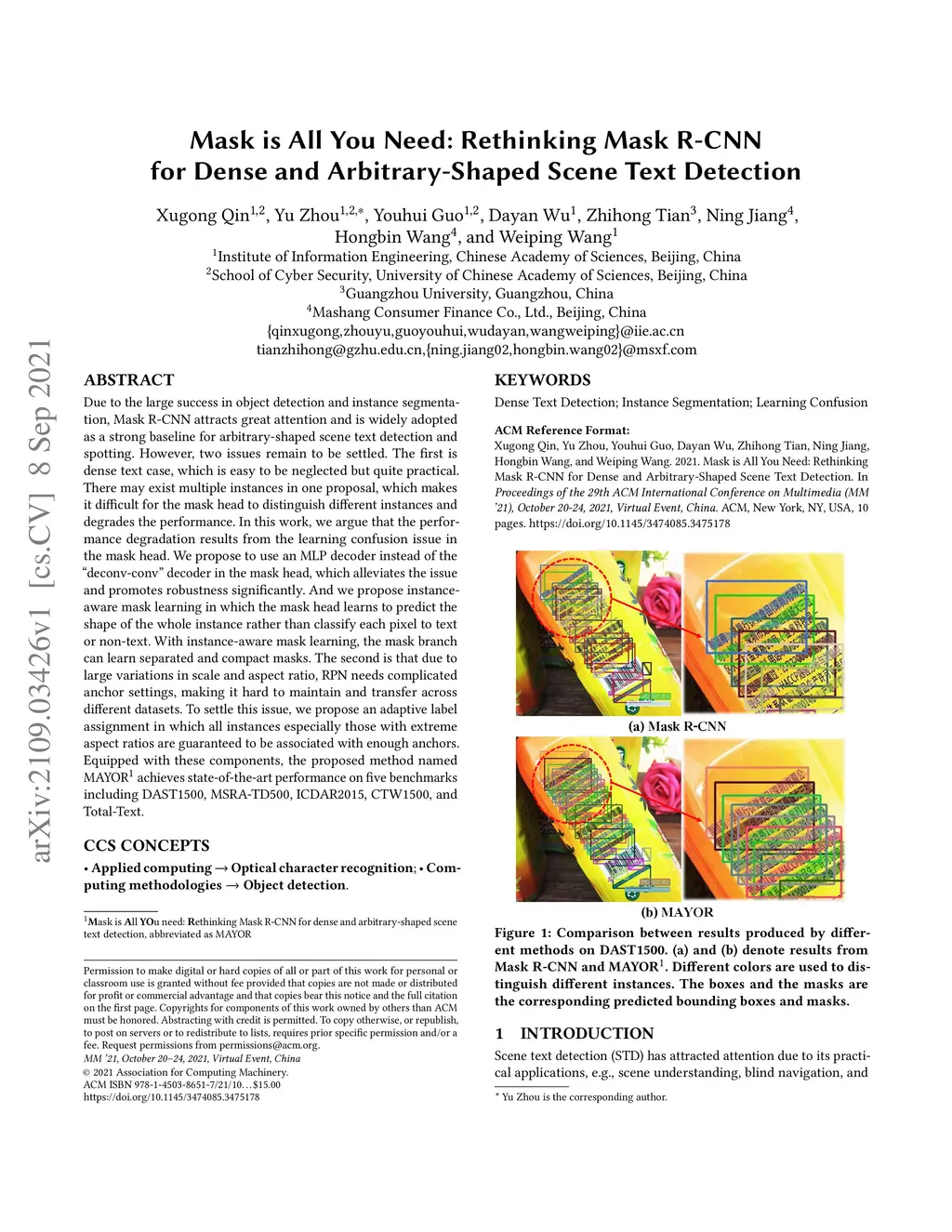 Due to the large success in object detection and instance segmentation, Mask R-CNN attracts great attention and is widely adopted as a strong baseline for arbitrary-shaped scene text detection and spotting. However, two issues remain to be settled. The first is dense text case, which is easy to be neglected but quite practical. There may exist multiple instances in one proposal, which makes it difficult for the mask head to distinguish different instances and degrades the performance. In this work, we argue that the performance degradation results from the learning confusion issue in the mask head. We propose to use an MLP decoder instead of the "deconv-conv" decoder in the mask head, which alleviates the issue and promotes robustness significantly. And we propose instance-aware mask learning in which the mask head learns to predict the shape of the whole instance rather than classify each pixel to text or non-text. With instance-aware mask learning, the mask branch can learn separated and compact masks. The second is that due to large variations in scale and aspect ratio, RPN needs complicated anchor settings, making it hard to maintain and transfer across different datasets. To settle this issue, we propose an adaptive label assignment in which all instances especially those with extreme aspect ratios are guaranteed to be associated with enough anchors. Equipped with these components, the proposed method named MAYOR achieves state-of-the-art performance on five benchmarks including DAST1500, MSRA-TD500, ICDAR2015, CTW1500, and Total-Text.