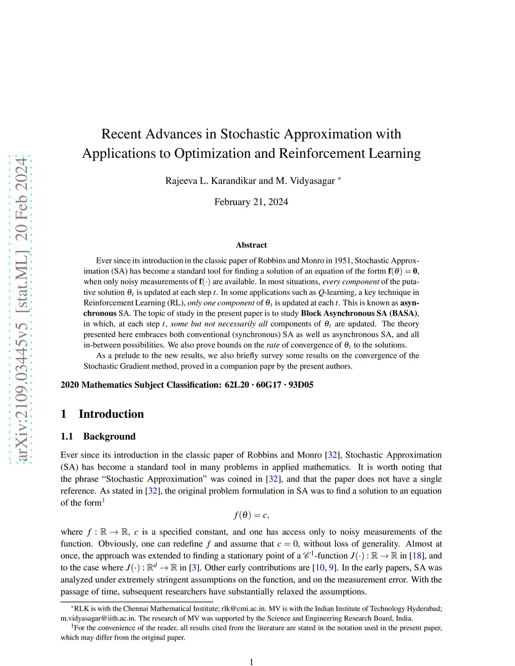 Ever since its introduction in the classic paper of Robbins and Monro in 1951, Stochastic Approximation (SA) has become a standard tool for finding a solution of an equation of the form , when only noisy measurements of are available. In most situations, \textit{every component} of the putative solution is updated at each step . In some applications such as -learning, a key technique in Reinforcement Learning (RL), \textit{only one component} of is updated at each . This is known as \textbf{asynchronous} SA. The topic of study in the present paper is to study \textbf{Block Asynchronous SA (BASA)}, in which, at each step , \textit{some but not necessarily all} components of are updated. The theory presented here embraces both conventional (synchronous) SA as well as asynchronous SA, and all in-between possibilities. We also prove bounds on the \textit{rate} of convergence of to the solutions. As a prelude to the new results, we also briefly survey some results on the convergence of the Stochastic Gradient method, proved in a companion paper by the present authors.