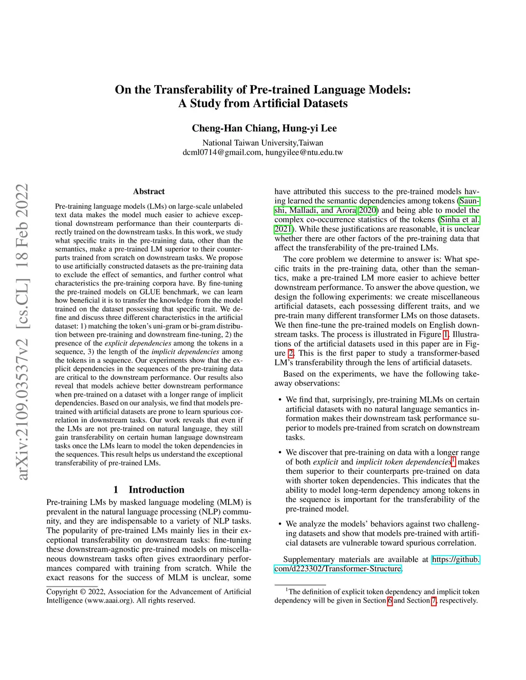 Pre-training language models (LMs) on large-scale unlabeled text data makes the model much easier to achieve exceptional downstream performance than their counterparts directly trained on the downstream tasks. In this work, we study what specific traits in the pre-training data, other than the semantics, make a pre-trained LM superior to their counterparts trained from scratch on downstream tasks. We propose to use artificially constructed datasets as the pre-training data to exclude the effect of semantics, and further control what characteristics the pre-training corpora have. By fine-tuning the pre-trained models on GLUE benchmark, we can learn how beneficial it is to transfer the knowledge from the model trained on the dataset possessing that specific trait. We define and discuss three different characteristics in the artificial dataset: 1) matching the token's uni-gram or bi-gram distribution between pre-training and downstream fine-tuning, 2) the presence of the explicit dependencies among the tokens in a sequence, 3) the length of the implicit dependencies among the tokens in a sequence. Our experiments show that the explicit dependencies in the sequences of the pre-training data are critical to the downstream performance. Our results also reveal that models achieve better downstream performance when pre-trained on a dataset with a longer range of implicit dependencies. Based on our analysis, we find that models pre-trained with artificial datasets are prone to learn spurious correlation in downstream tasks. Our work reveals that even if the LMs are not pre-trained on natural language, they still gain transferability on certain human language downstream tasks once the LMs learn to model the token dependencies in the sequences. This result helps us understand the exceptional transferability of pre-trained LMs.