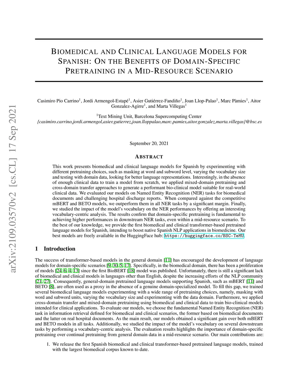This work presents biomedical and clinical language models for Spanish by experimenting with different pretraining choices, such as masking at word and subword level, varying the vocabulary size and testing with domain data, looking for better language representations. Interestingly, in the absence of enough clinical data to train a model from scratch, we applied mixed-domain pretraining and cross-domain transfer approaches to generate a performant bio-clinical model suitable for real-world clinical data. We evaluated our models on Named Entity Recognition (NER) tasks for biomedical documents and challenging hospital discharge reports. When compared against the competitive mBERT and BETO models, we outperform them in all NER tasks by a significant margin. Finally, we studied the impact of the model's vocabulary on the NER performances by offering an interesting vocabulary-centric analysis. The results confirm that domain-specific pretraining is fundamental to achieving higher performances in downstream NER tasks, even within a mid-resource scenario. To the best of our knowledge, we provide the first biomedical and clinical transformer-based pretrained language models for Spanish, intending to boost native Spanish NLP applications in biomedicine. Our best models are freely available in the HuggingFace hub: https://huggingface.co/BSC-TeMU.